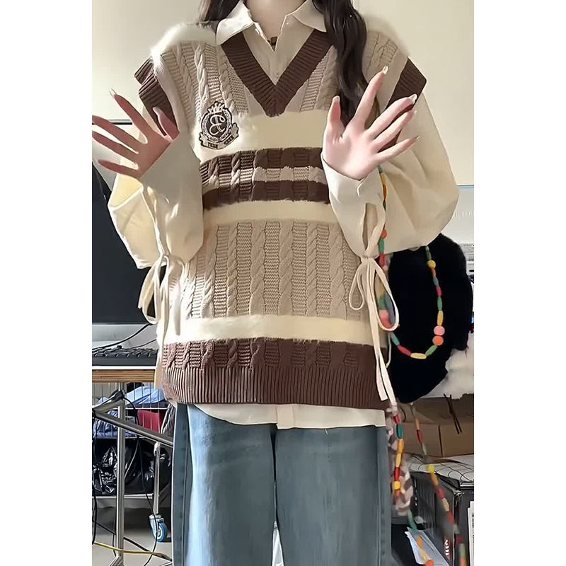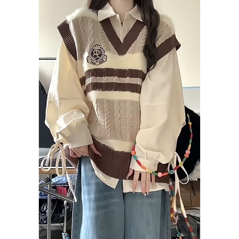 Preppy style autumn two-piece set embroidered knitted vest sweater female student + apricot shirt two pieces/suit