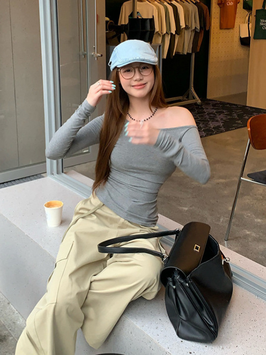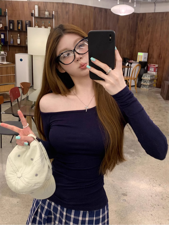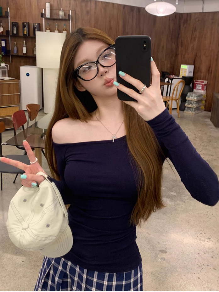 Pure Desire Hot Girl Slim Fit Off-Shoulder Long Sleeve T-Shirt Women's Early Autumn Design Easiest for Match Bottoming Shirt Student Top