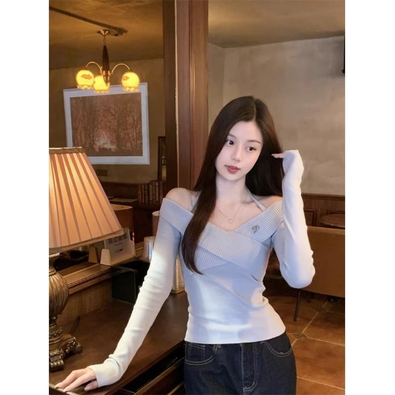 Pure Sweet and Spicy Hanging Neck Cross off-shoulder Knitted Top Women's Short Autumn and Winter Inner Tight Sweater Base Shirt for Women