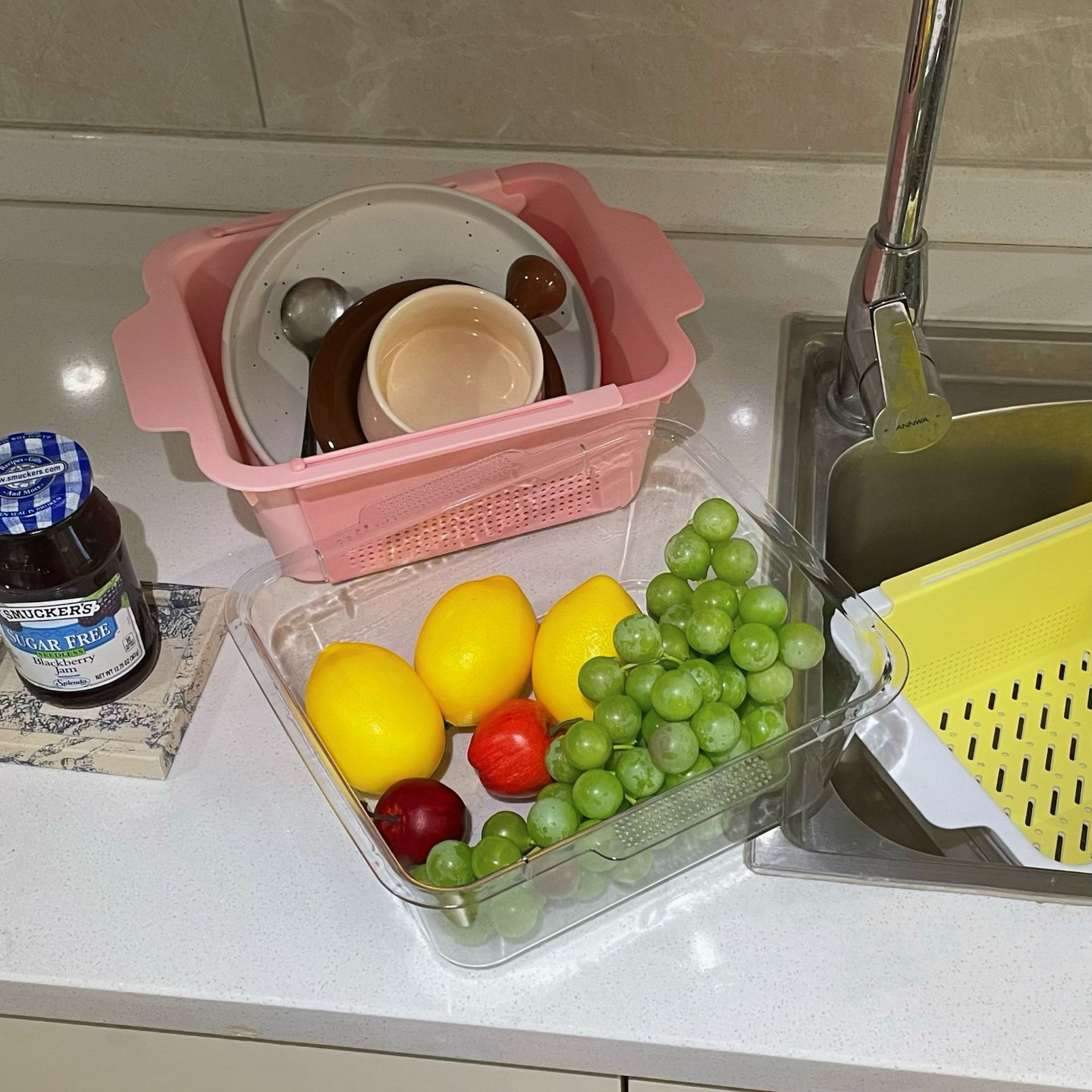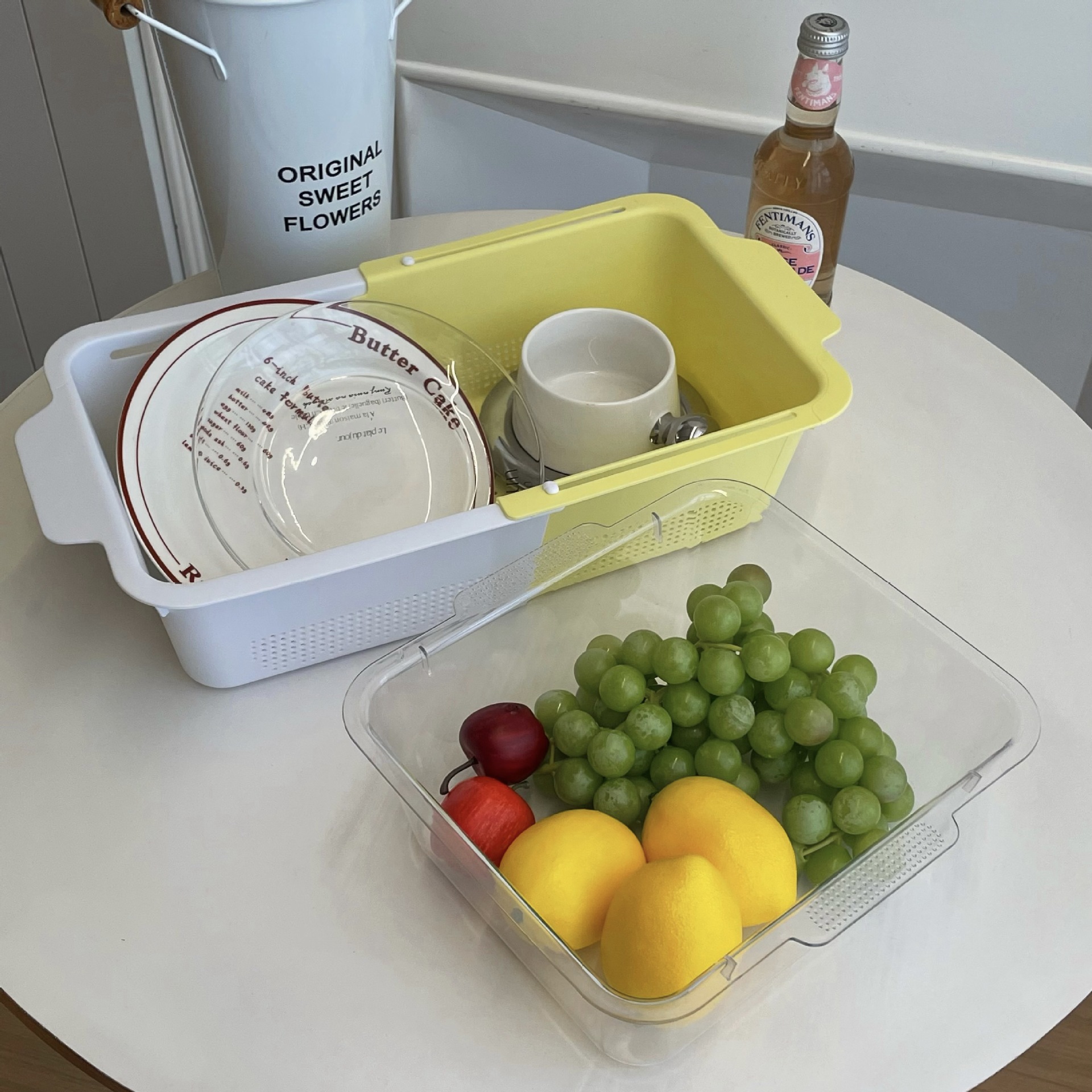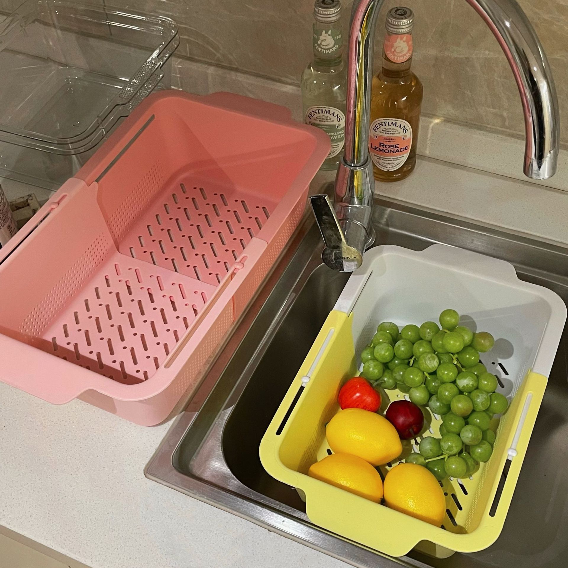 Retractable Draining Basket Macaron Tone Double-Layer Dual-Use Multi-Function Fruit Plate Vegetable Basket Home Kitchen Supplies