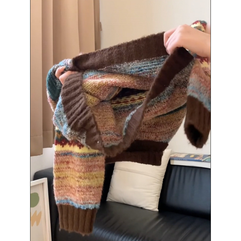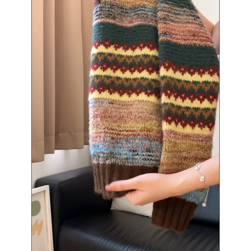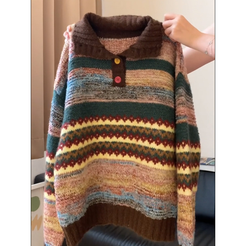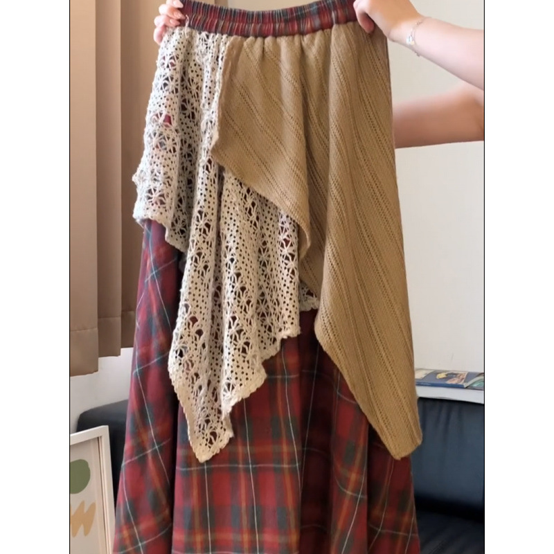 Retro Art Department suit Women's Autumn and Winter Contrast Polo Collar Knitted Shirt Plaid Stitching Chic Skirt Set