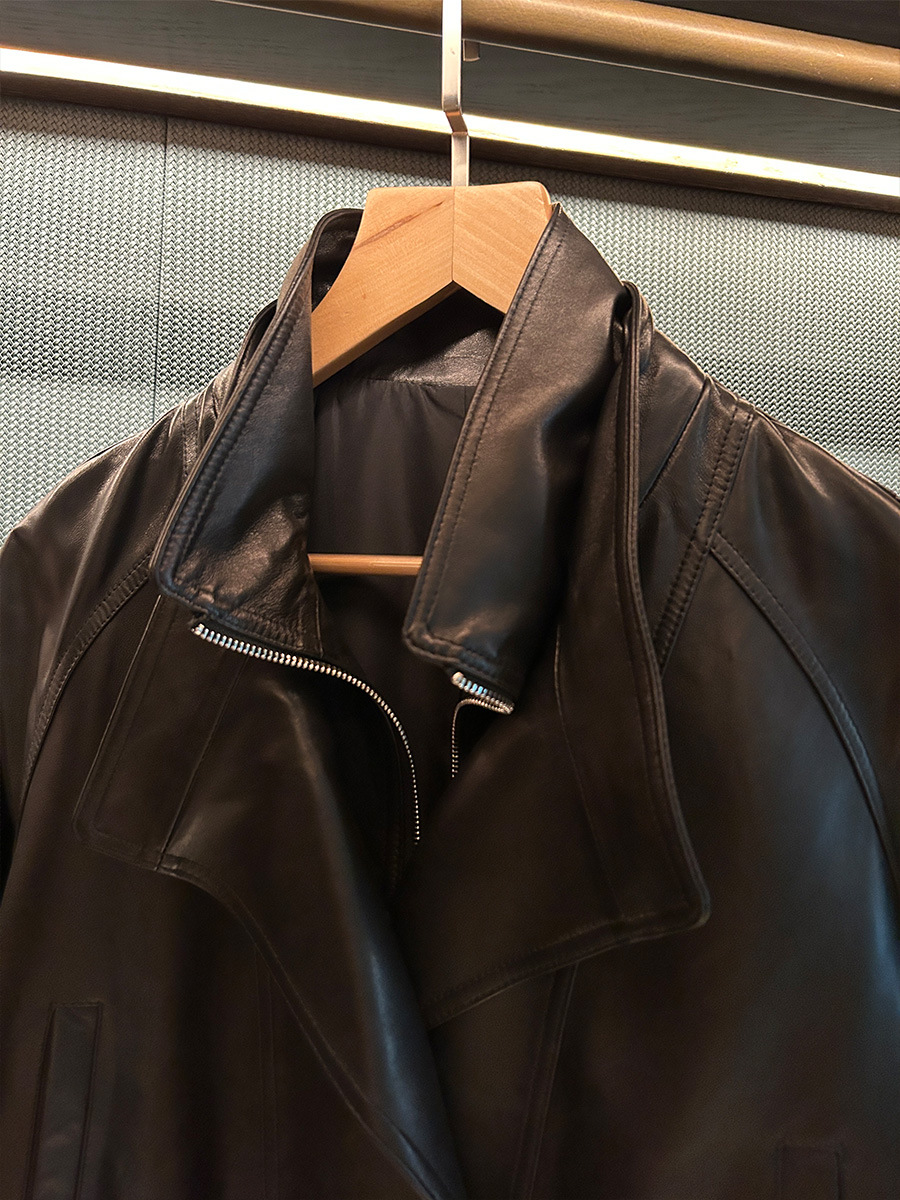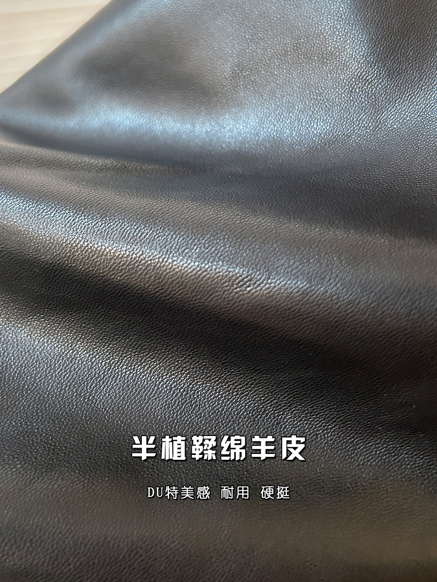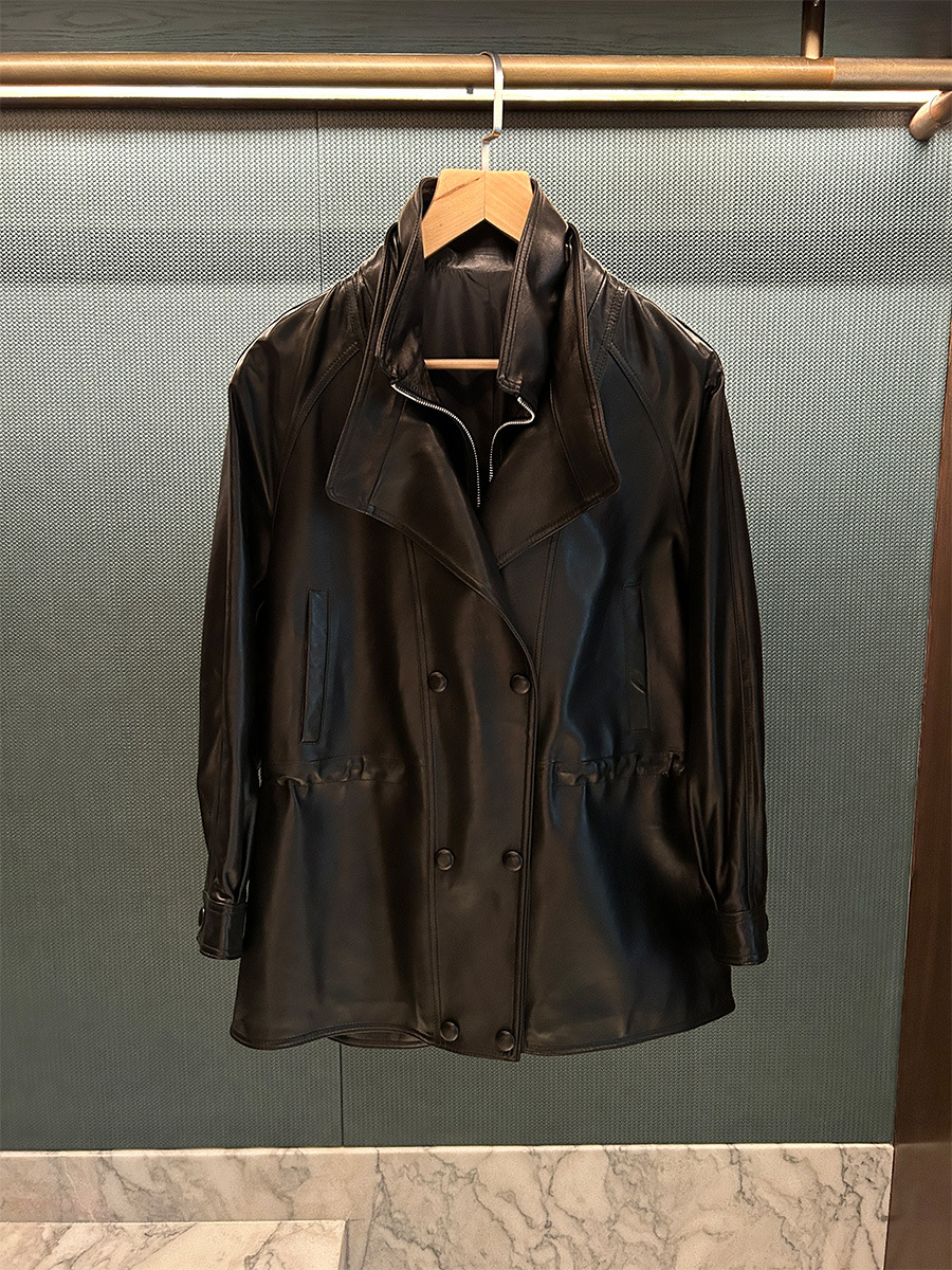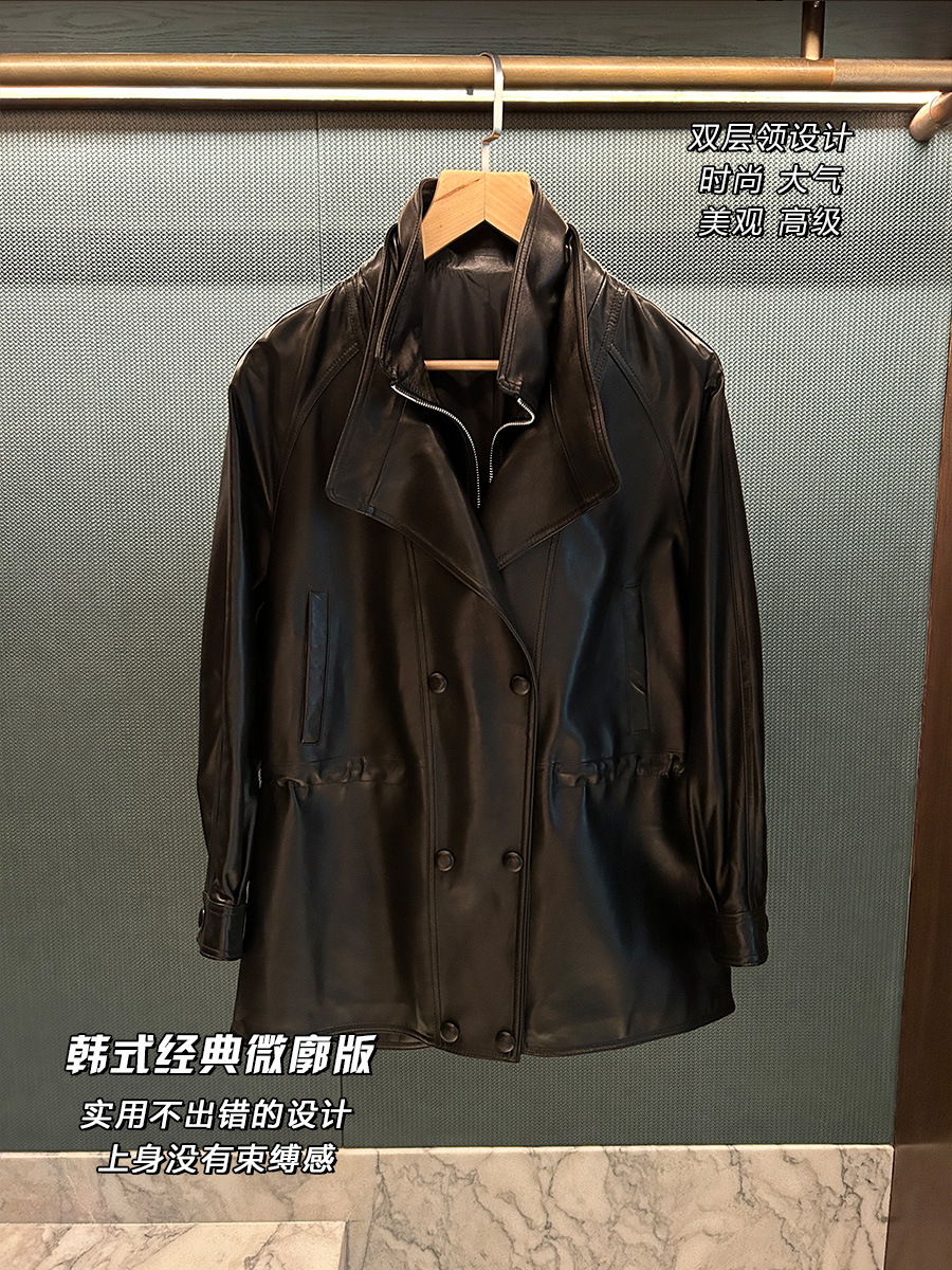 Retro Double-Breasted Double-Layer Collar Silhouette Loose Vegetable Tanned Goatskin Mid-Length Leather Windbreaker Genuine Leather Jacket for Women