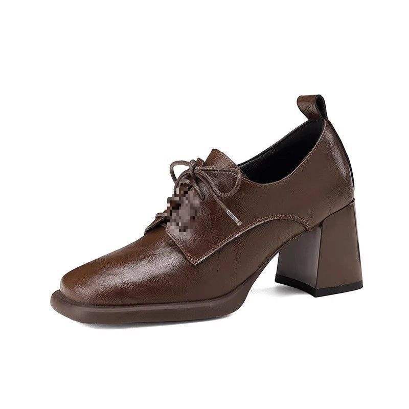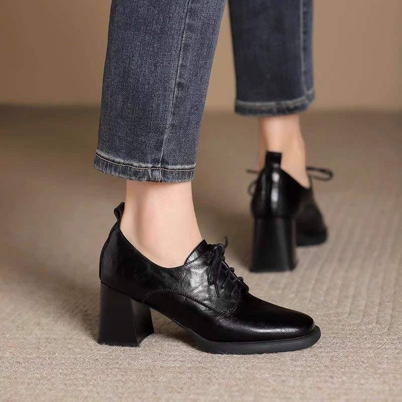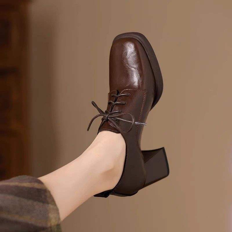 Retro Style Square Toe 6cm Lace-Up Leather Shoes Deep Mouth Flats for Women 2025 New Versatile British Style High Heels Women's Shoes