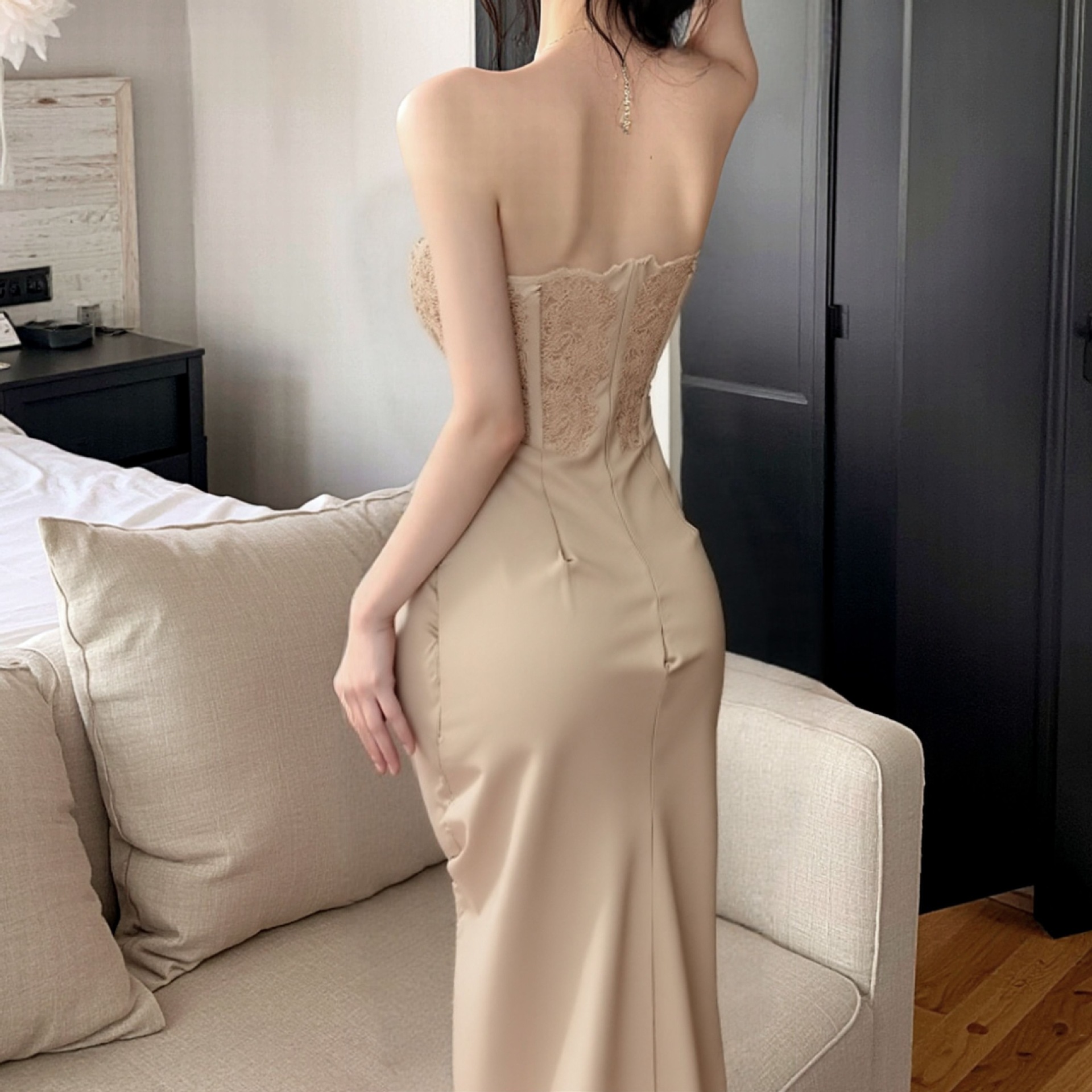 Sexy Backless Long Dress for Women, Banquet Gown, Off-Shoulder Pure Lace Patchwork Strapless Dress, Wholesale