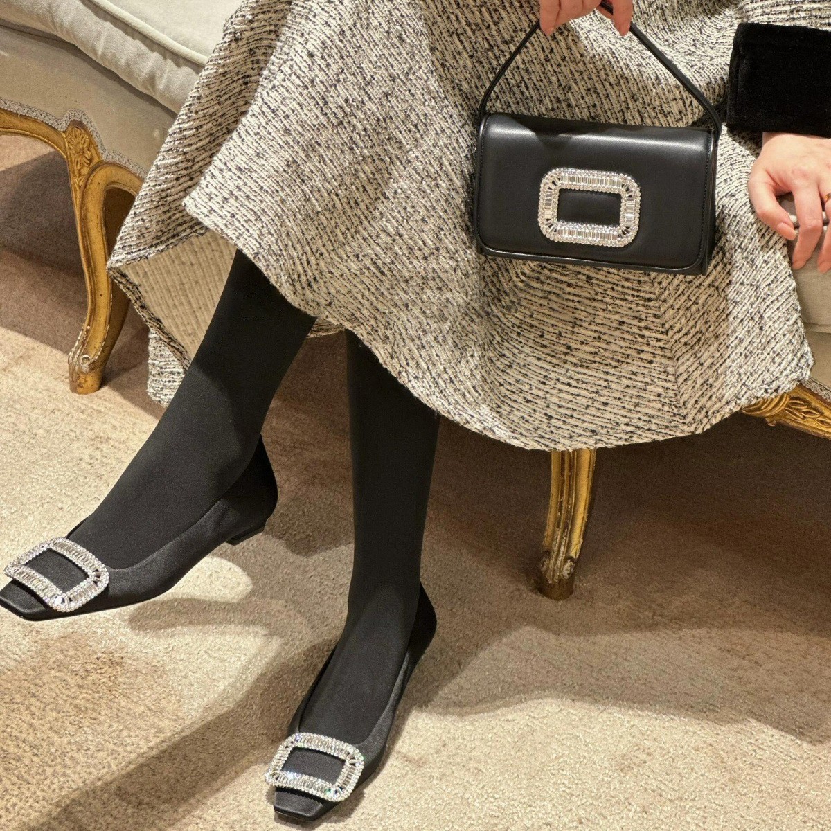 Sheepskin version ~ beautiful rhinestone square buckle leather small heel shoes women's French square head Mary Jane single shoes ladle shoes evening shoes