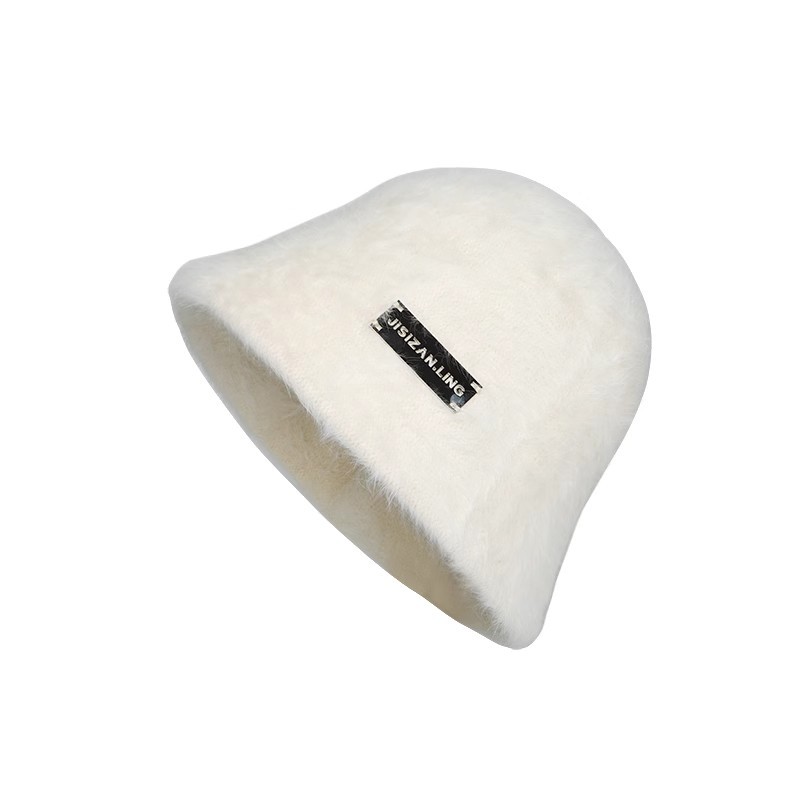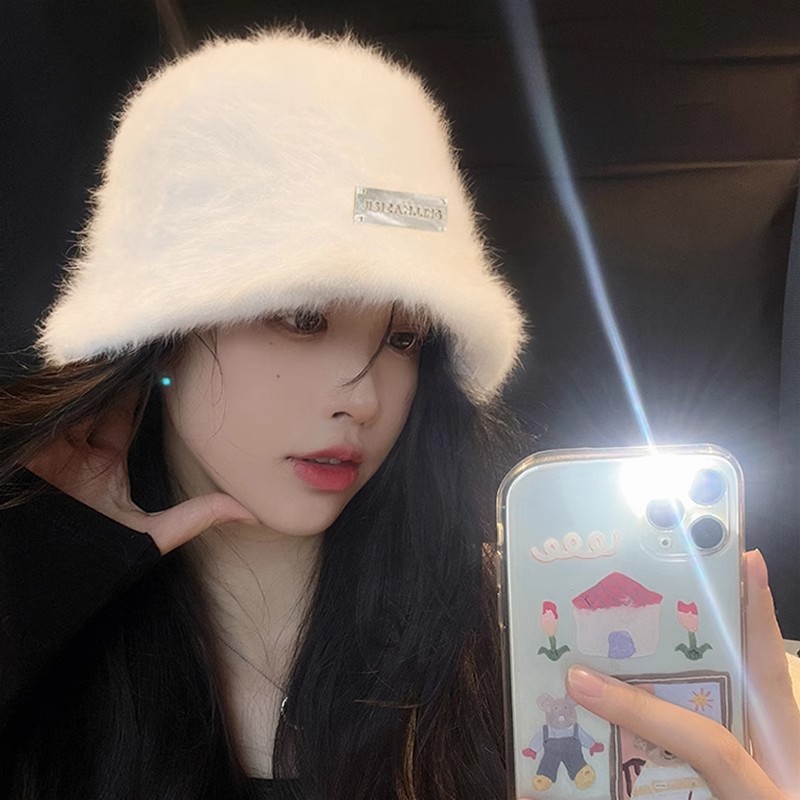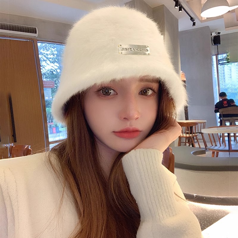 Shown Face Small Rabbit Fur Fisherman Hat Women's Autumn and Winter All-match Warm Big Head Basin Hat White Plain Plush Bucket Hat