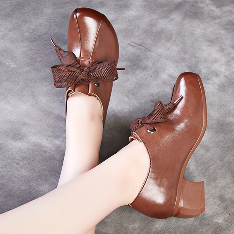 Single Shoes for Women's Outer Wear 2022 Autum Lace-Up Thick Heel Soft Sole Middle-Aged Small Leather Shoes First Layer Cowhide Retro Women's Shoes Wholesale