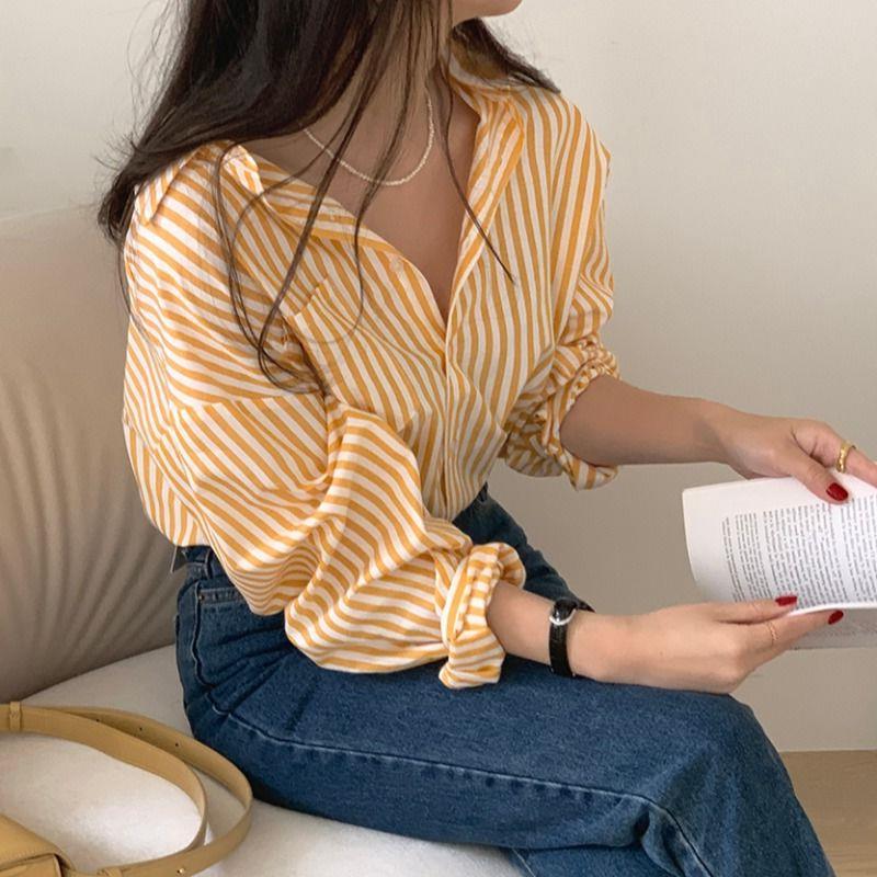 South Korea chic summer French style niche lapel fashion casual loose white green striped shirt top for women
