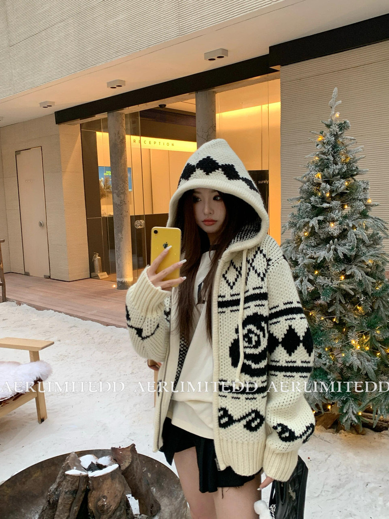 South Korea openyy elk rose jacquard zipper hooded sweater coat women's relaxed-fit casual knitted cardigan