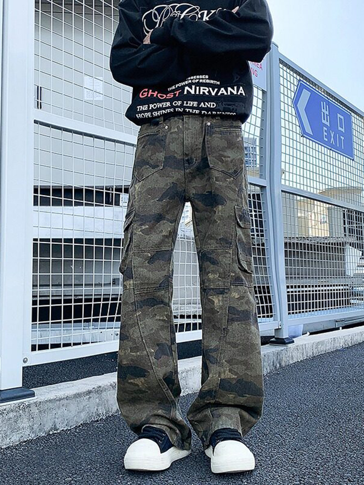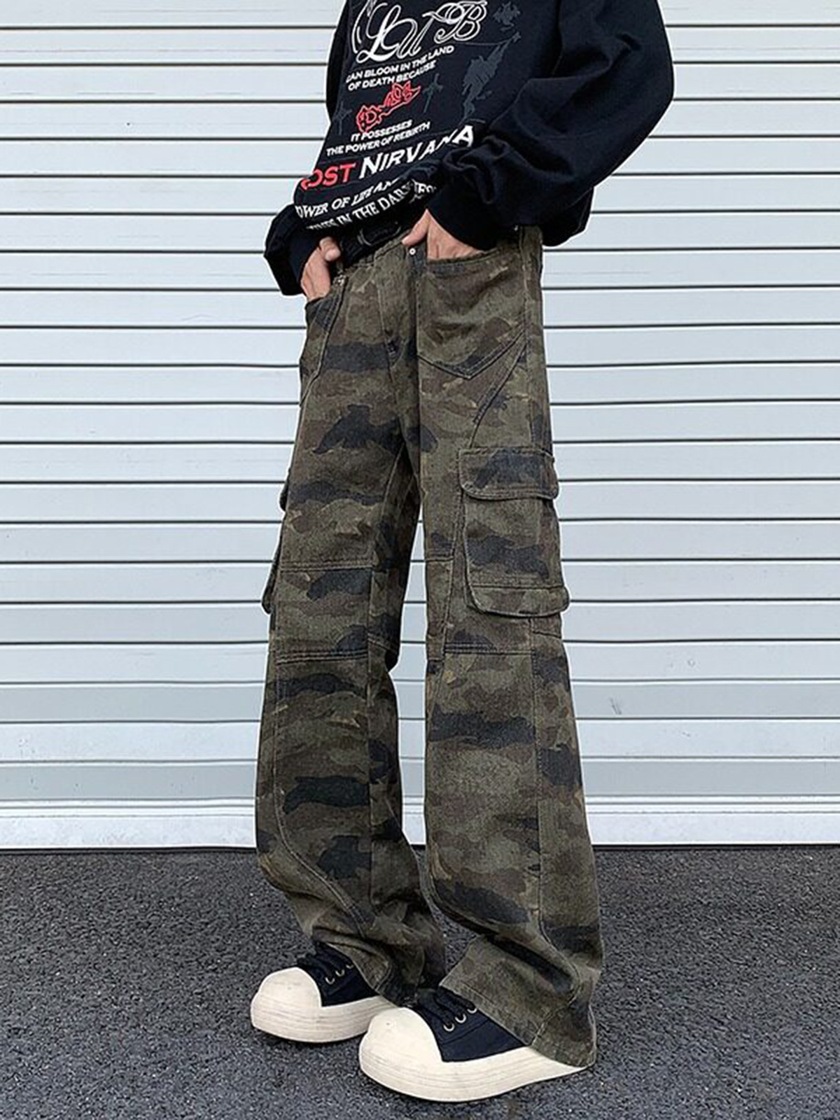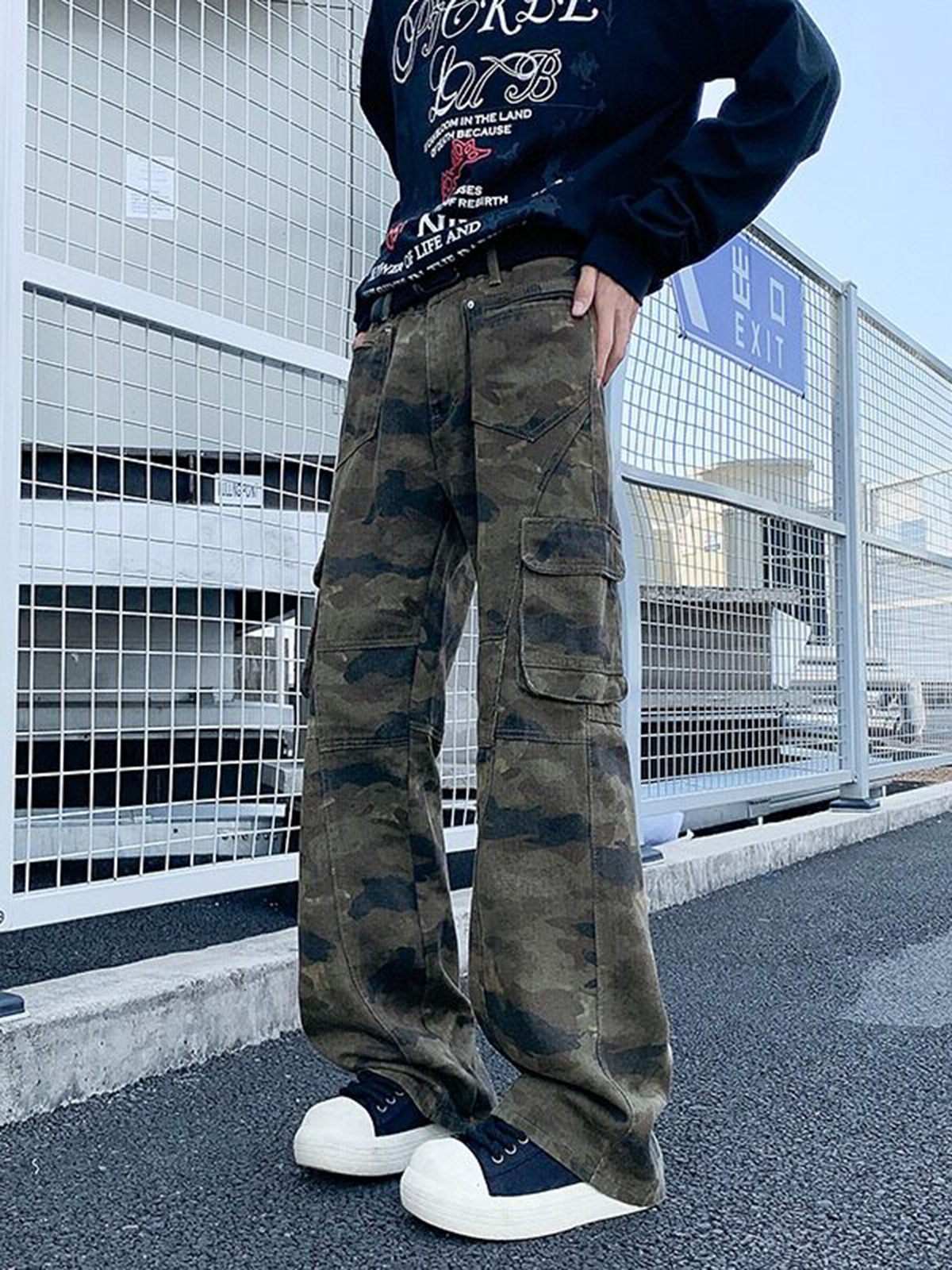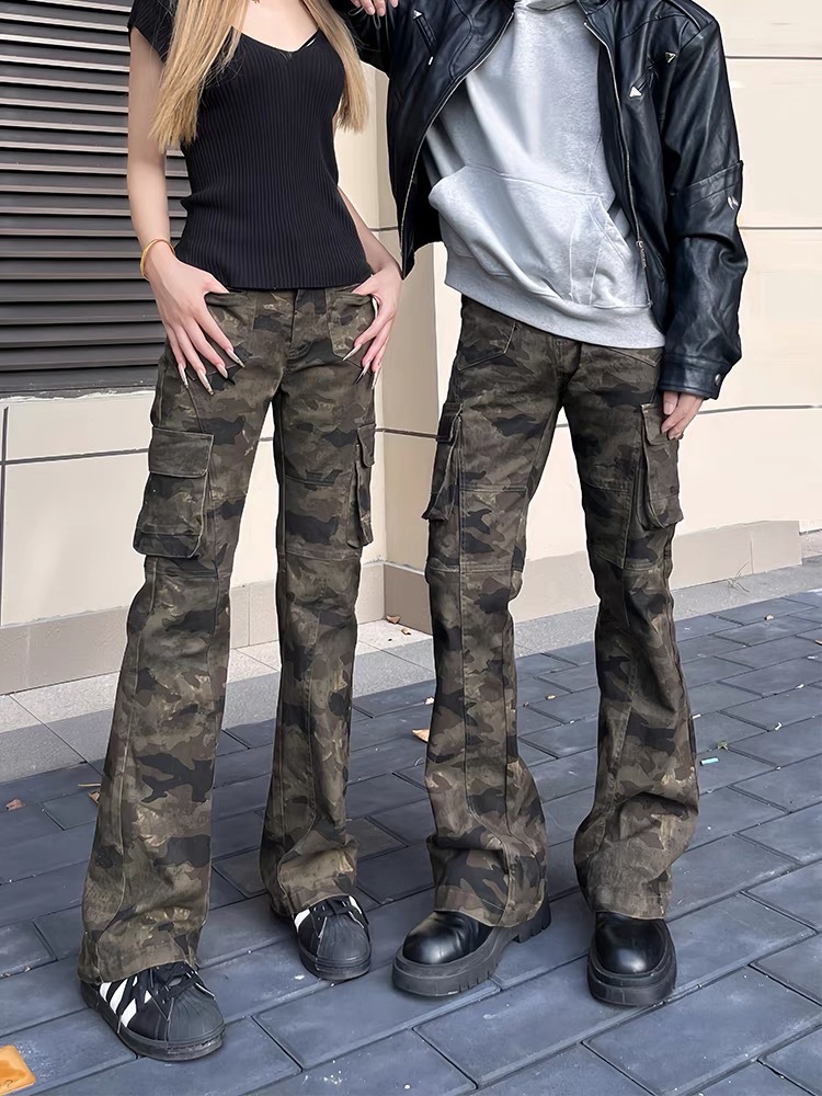 Spliced Logging Camouflage Crowns Pants Men's Spring and Autumn Multi-Pocket Vibe Pants American Style Retro Straight Micro-Flared Pants