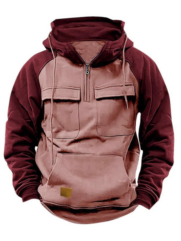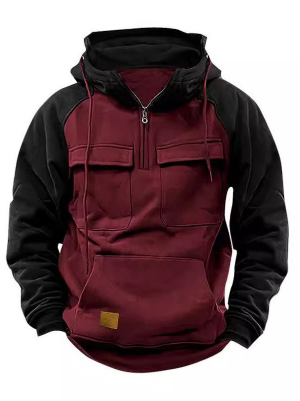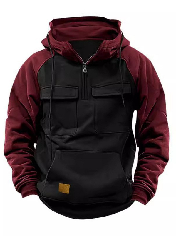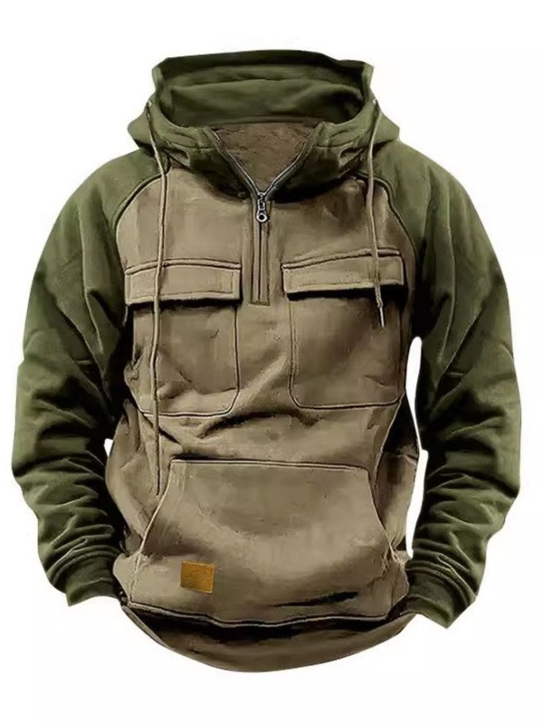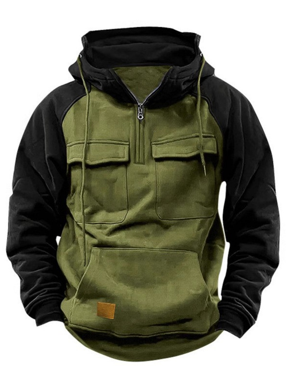 Spring and Autum Men's Half-Zip Workwear Pullover Hoodie Sports Running Outdoor Multi-Flap Pocket Pants Raglan Sleeve Long-Sleeved Sweatshirt