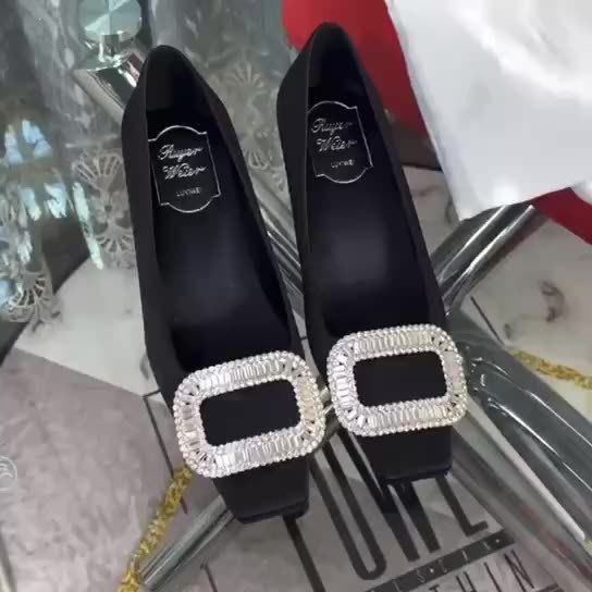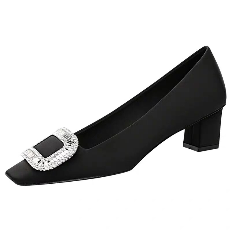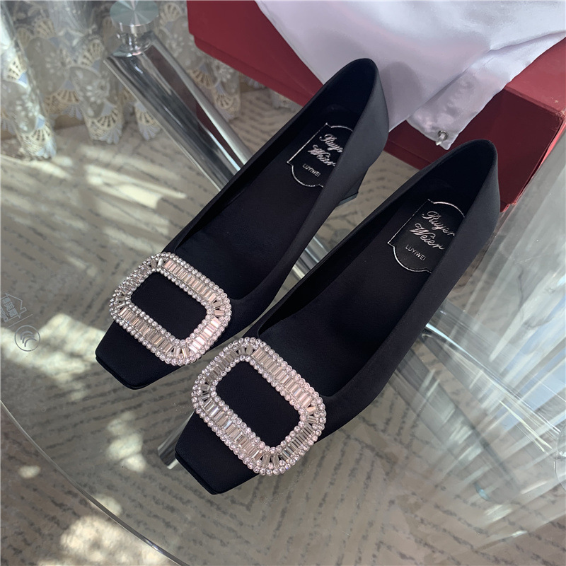 Square Buckle Single-layer Shoes 2025 Classic R Black V All-match Shallow Mouth Silk Satin Square Head Thick Heel Lazy Slip-on Women's Shoes
