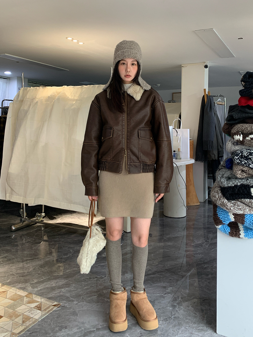Sroom Thirteen Lines Fur Integrated Jacket Women's Winter Velvet Brown Leather Jacket High-End Maillard Jacket