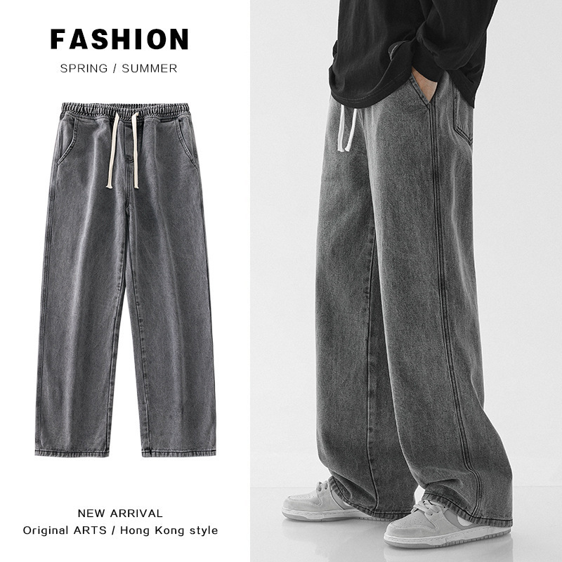 Straight loose jeans men's spring and autumn new fashion brand ins elastic waist casual wide-leg high street trousers