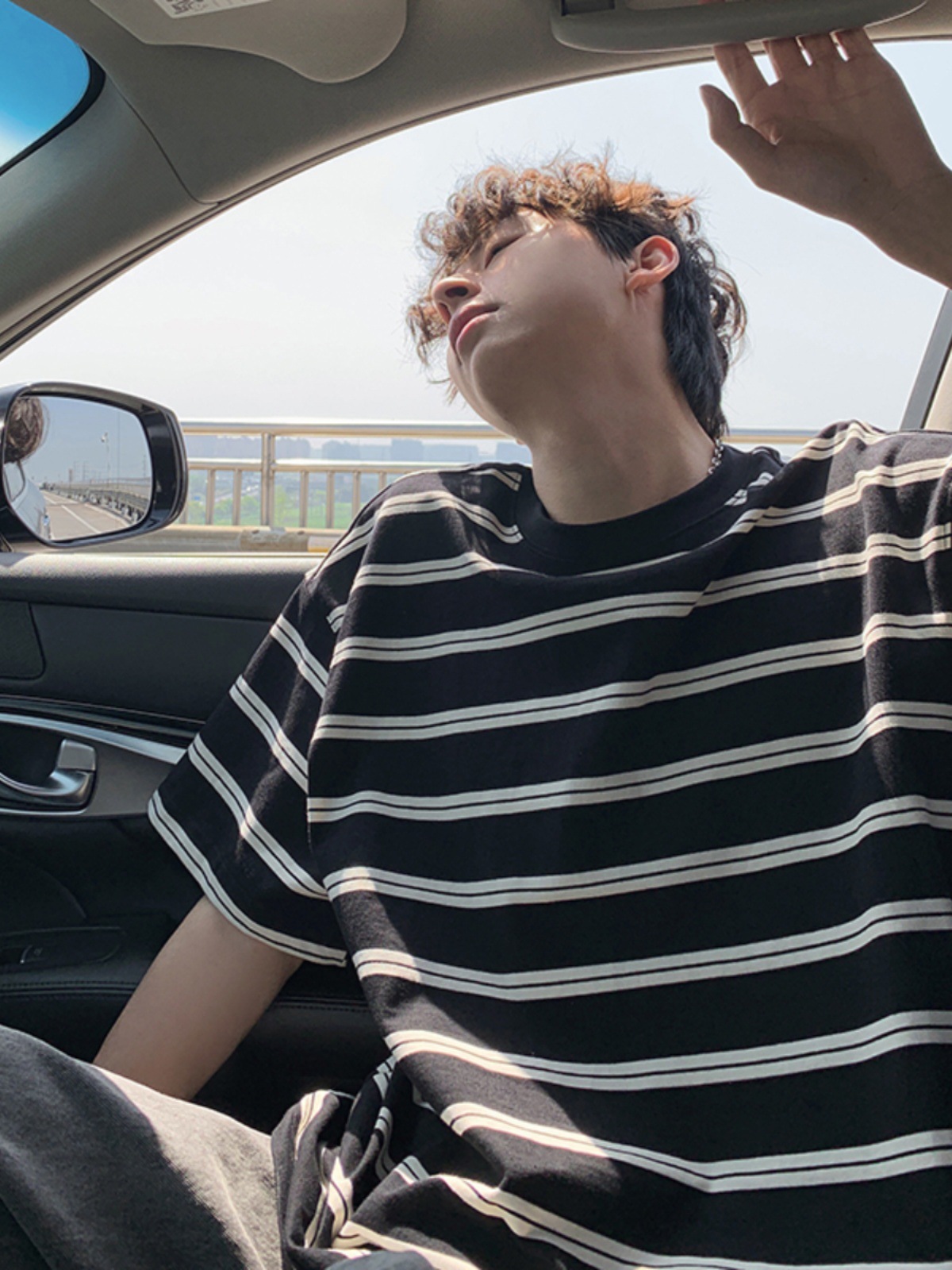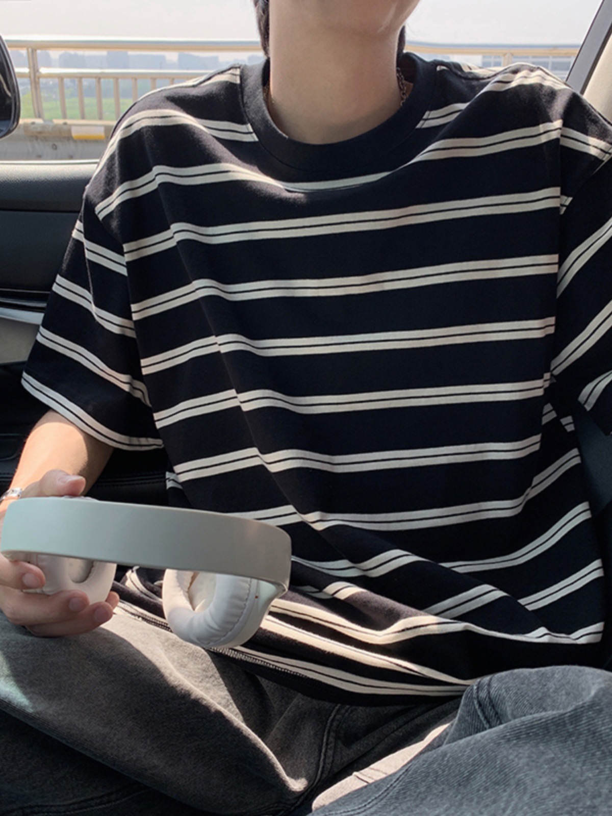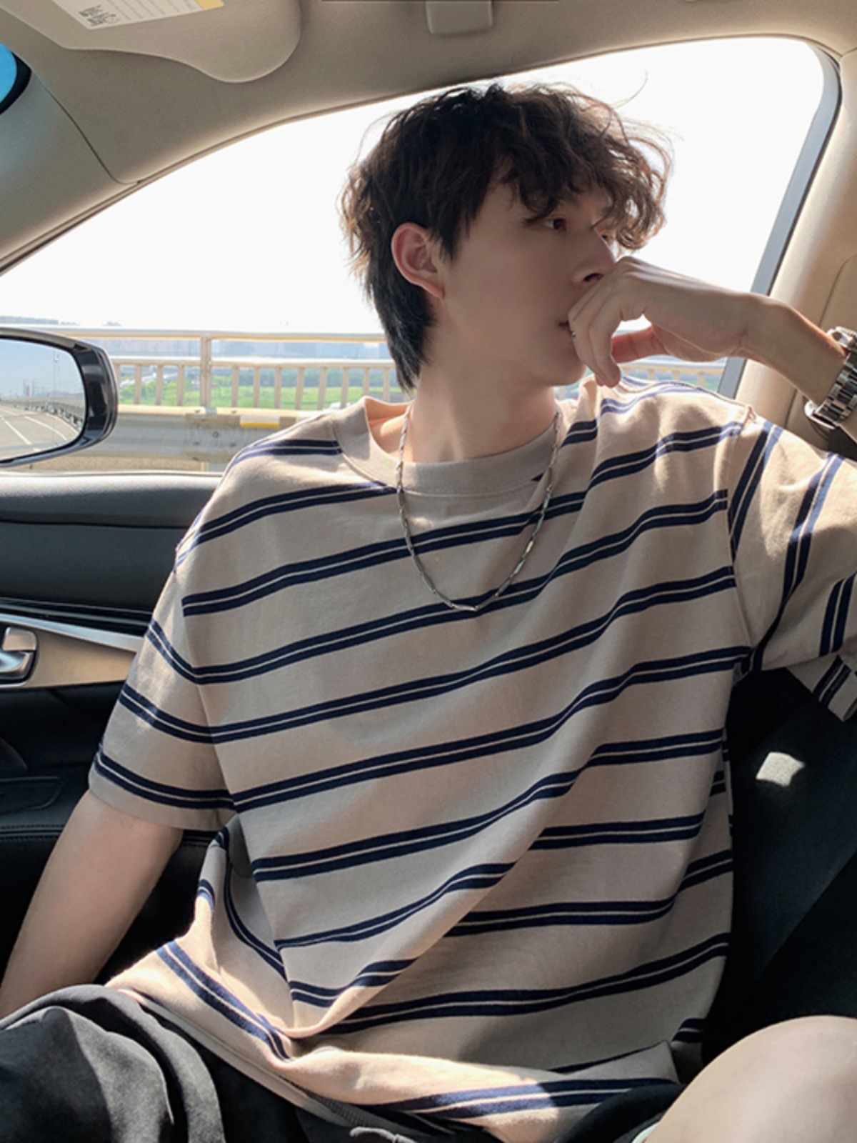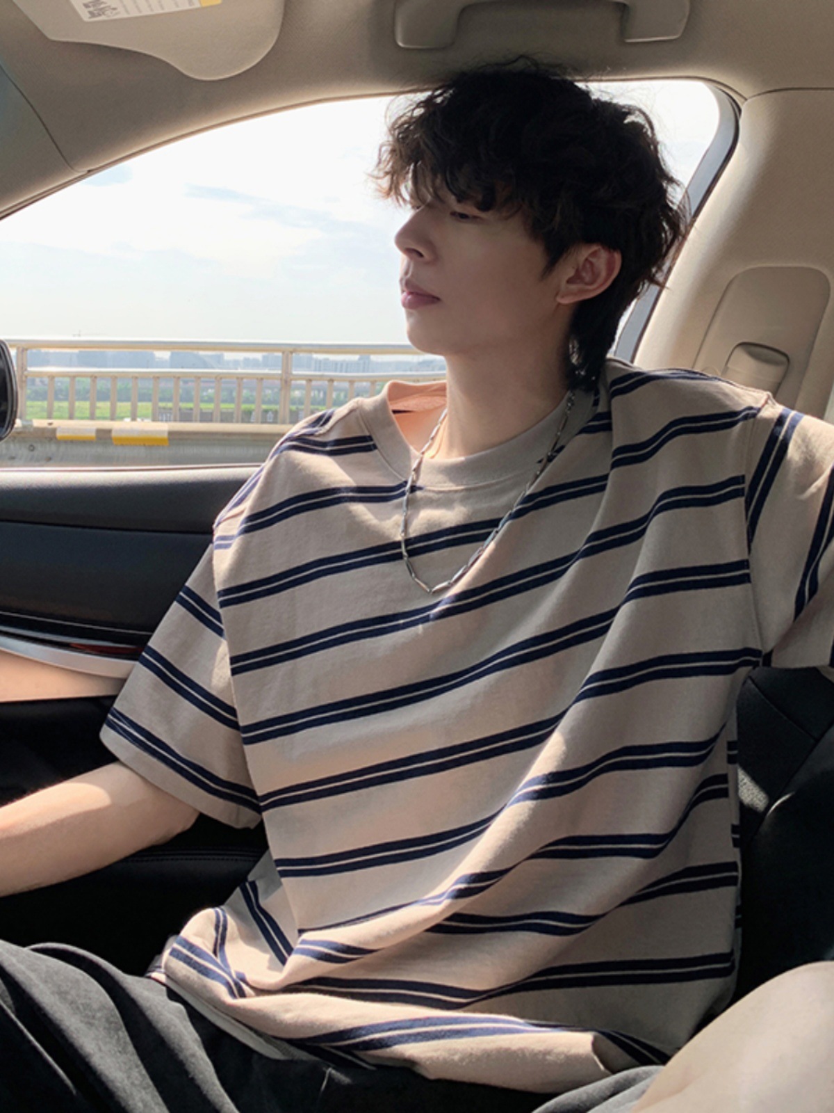 Striped Short-sleeved T-shirt Men's 2024 Summer New Heavy-weight College-style Loose Thin Half-sleeved Half-sleeve T-shirt