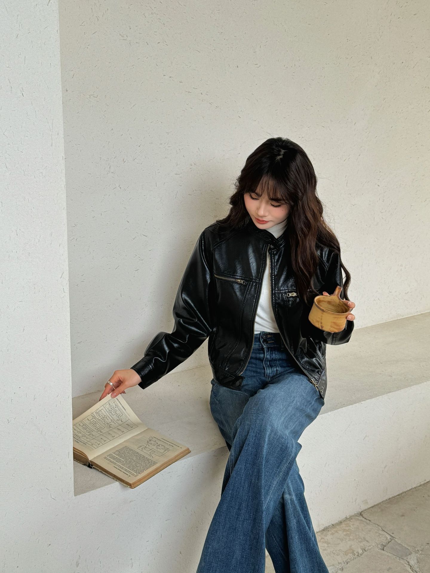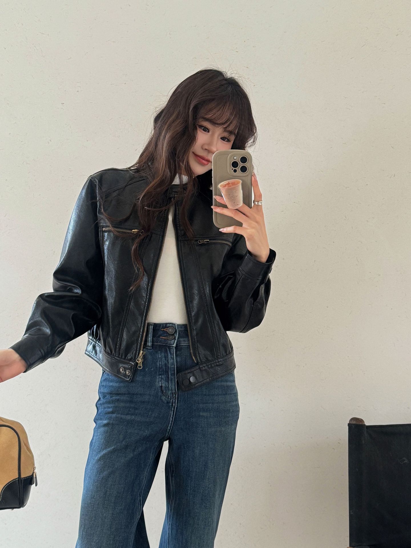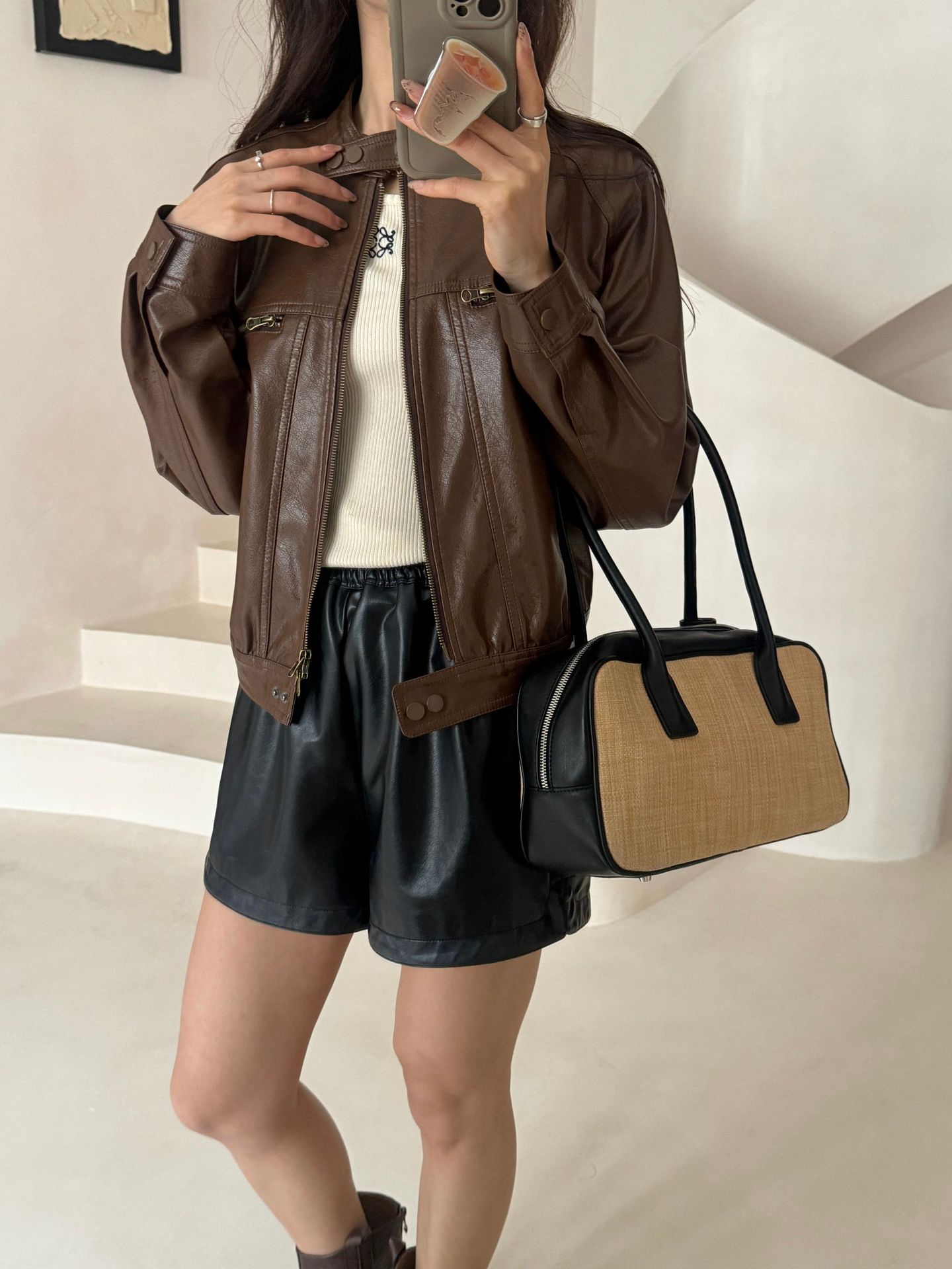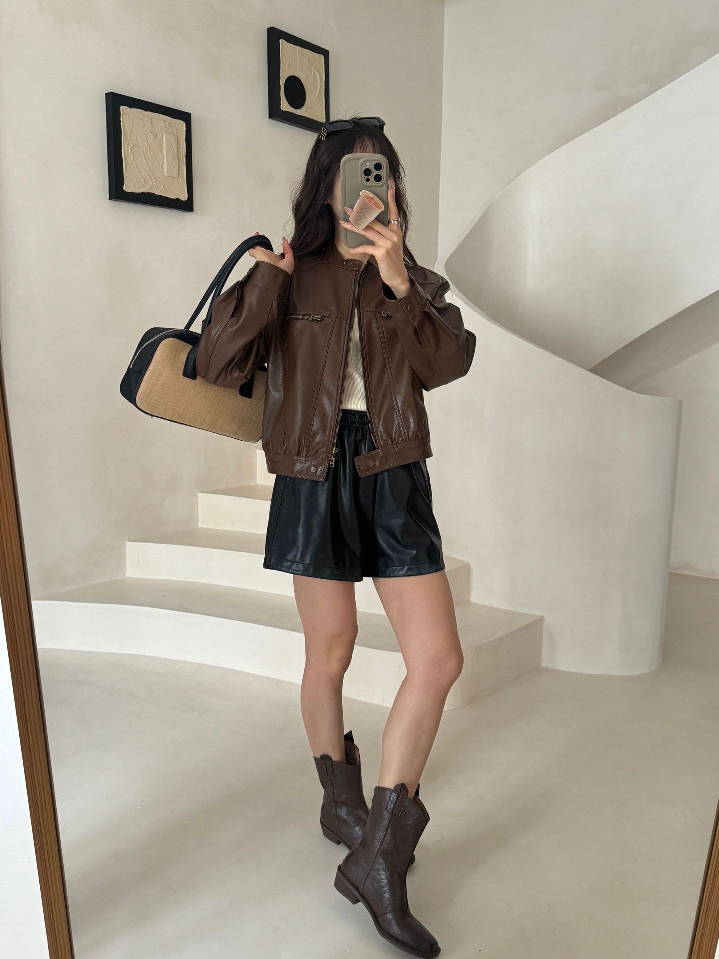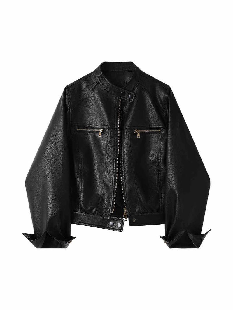 Thirteen Lines Early Autumn Round Neck Loose Black Brown PU Leather Jacket Coat Small American Leather Biker Suit