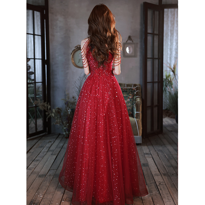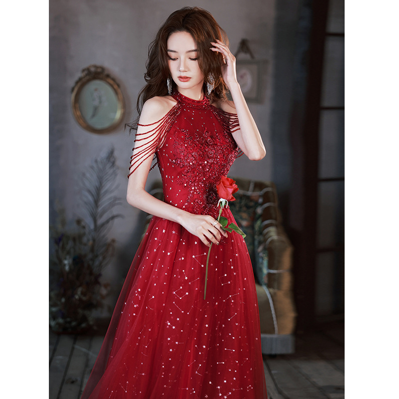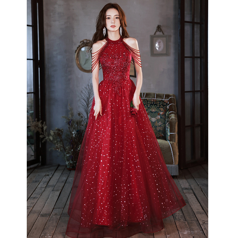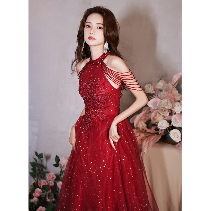 Toast Wear Bride 2025 New Wedding Burgundy Halter Sexy High-End Evening Dress Women's High-End Gauze Skirt