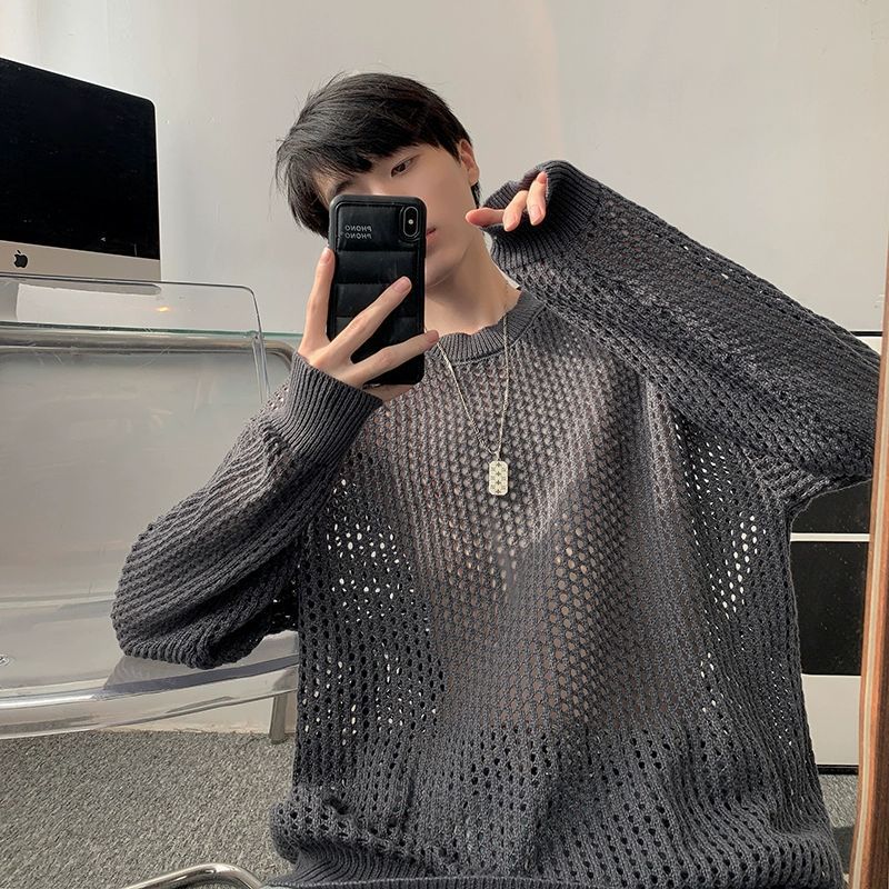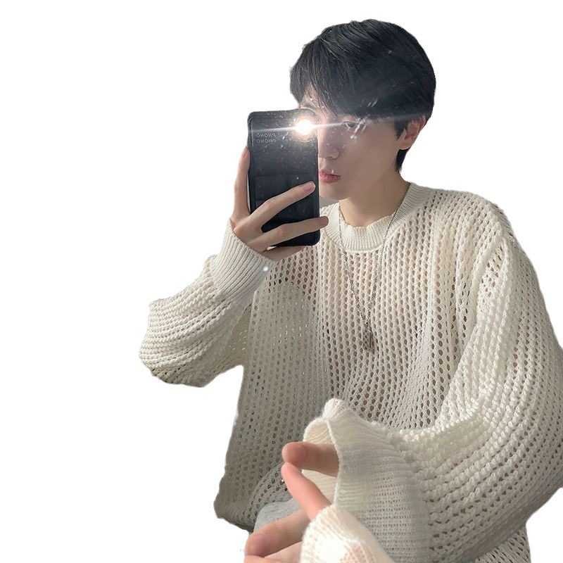 White Round Neck Hollow Sweater Men's 2024 Autumn Fashion Brand Rapped Sweater Retro All-match Loose Sweater Top