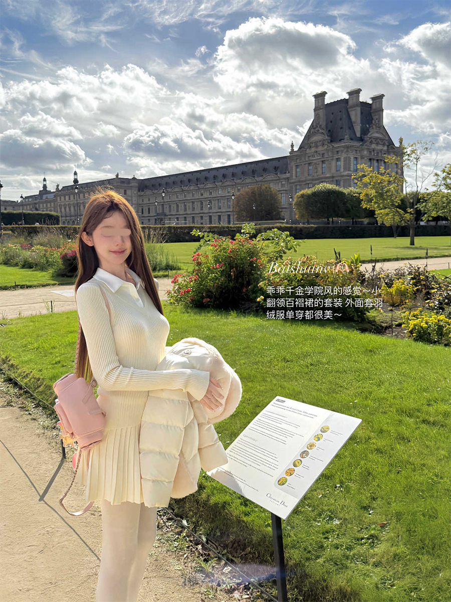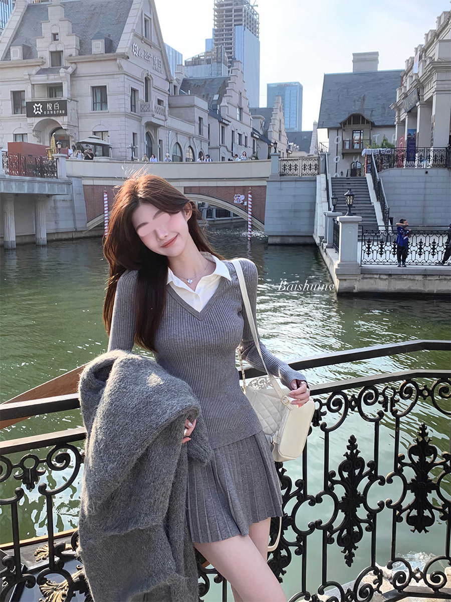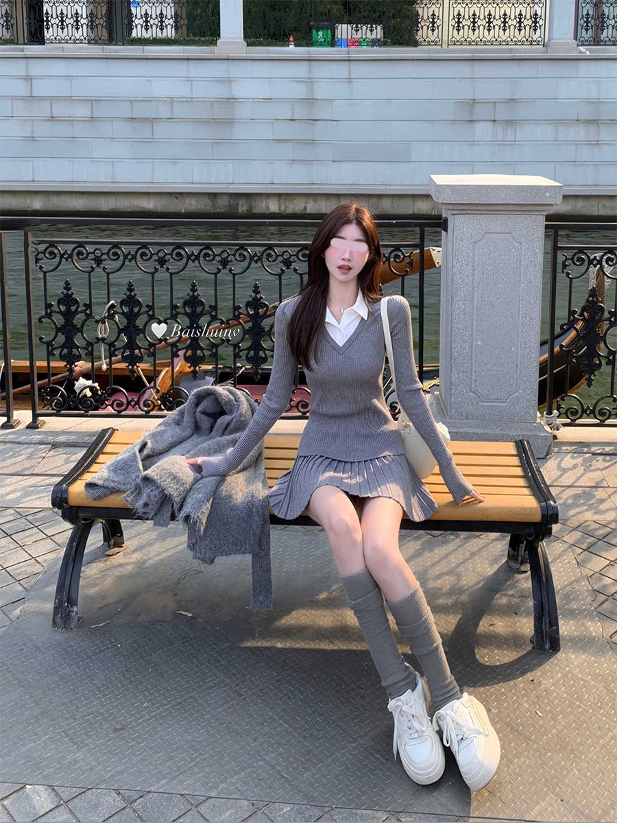 White Water Women's Qiajin College Style Fake Two-Piece Knitted Shirt A- Shape Skirt Women's Autumn and Winter Korean Style Temperament suit