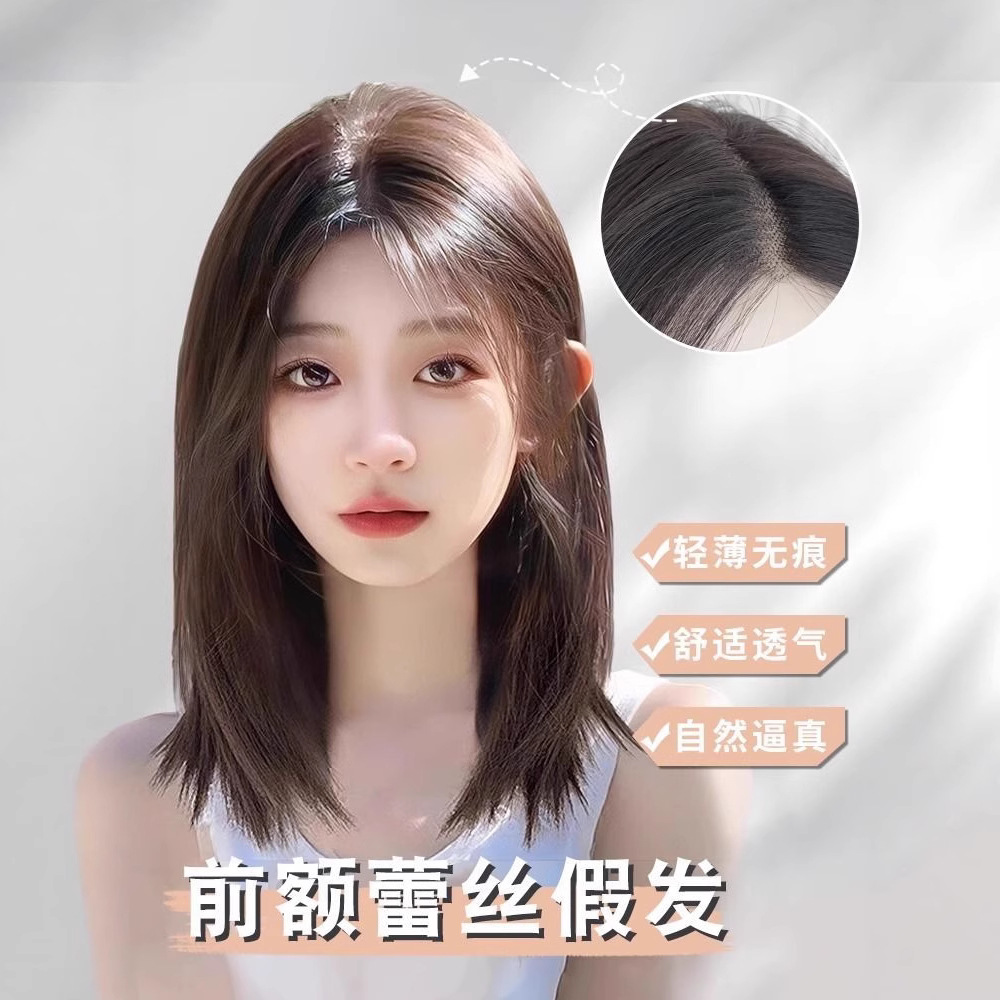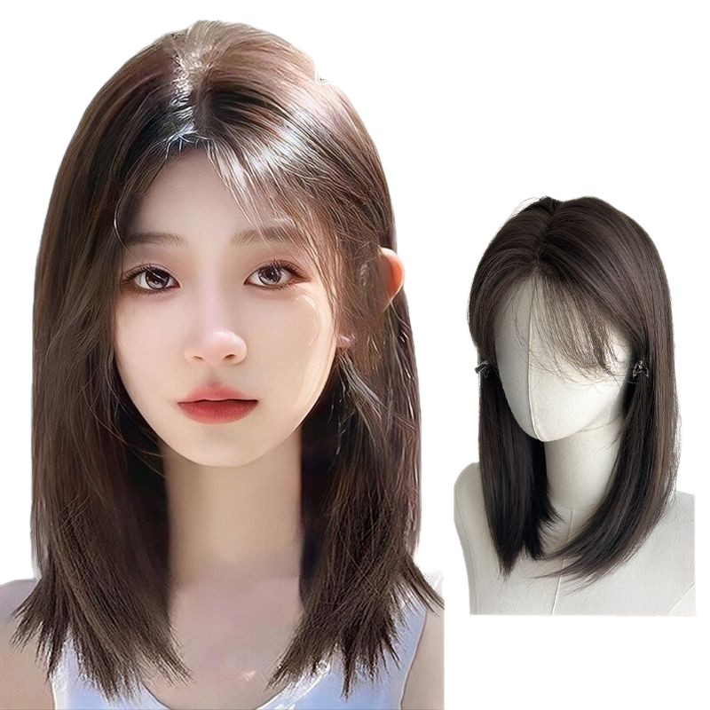 Wig for Women with Medium and Long Hair, Forehead Lace, Figure-Eight Bangs, Clavicle Hair, Simulated Human Hair, Age-Reducing Middle-Parted Wig, Full Headgear