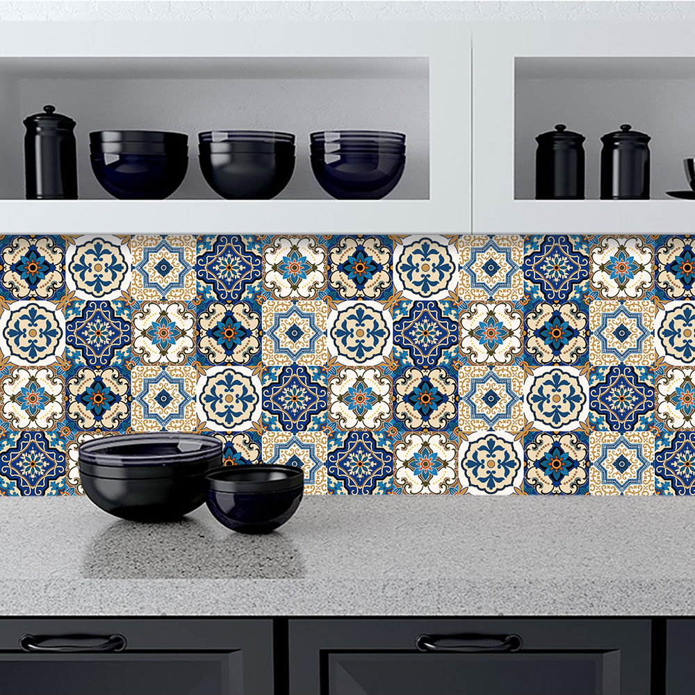 European Retro Moroccan Style Patterned Tile Stickers Crystal Hard Sheet Kitchen Bathroom Home Decoration Self-Adhesive Wall Stickers