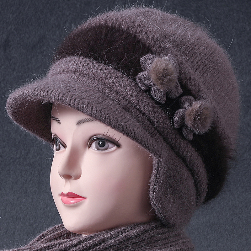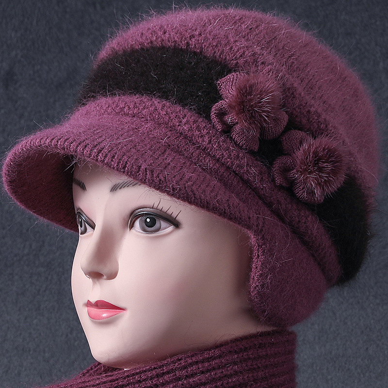Women's rabbit fur knitted warm cap for middle-aged and elderly grandma fleece-lined cold-proof wool ear protection cap fashion mother