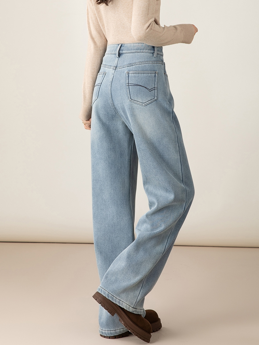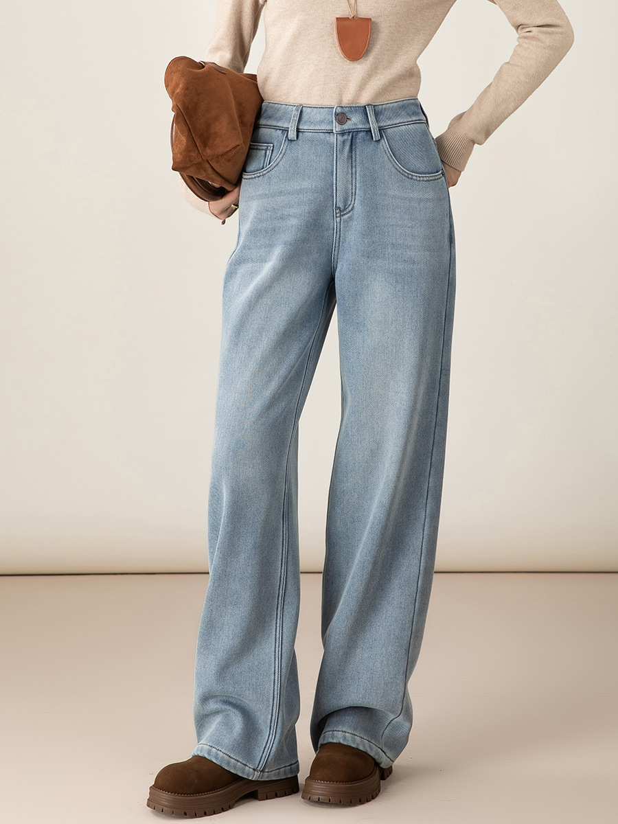 Xinge Fleece-Lined Dark Blue Long Straight Jeans for Women 2025 Winter New Loose Slimming Narrow Wide-Leg Pants