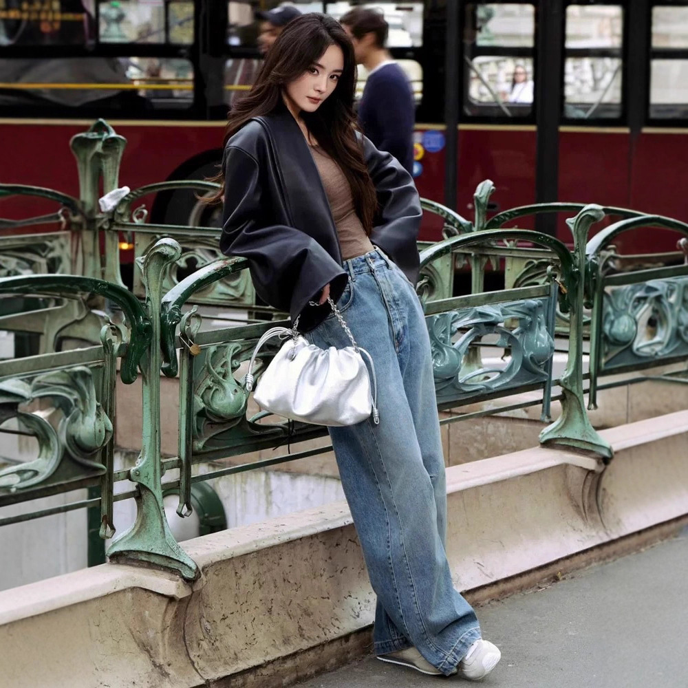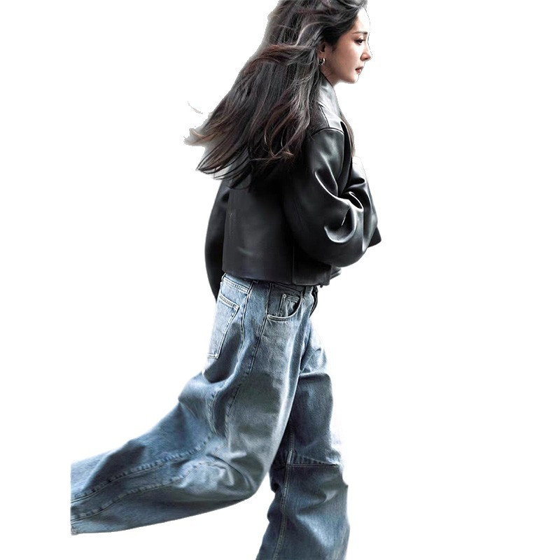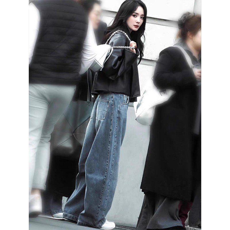 Yang Mi Blue Wide-Leg Jeans for Women, Autumn Celebrity Style, Retro High-Waisted, Slimming, Loose Straight Pants