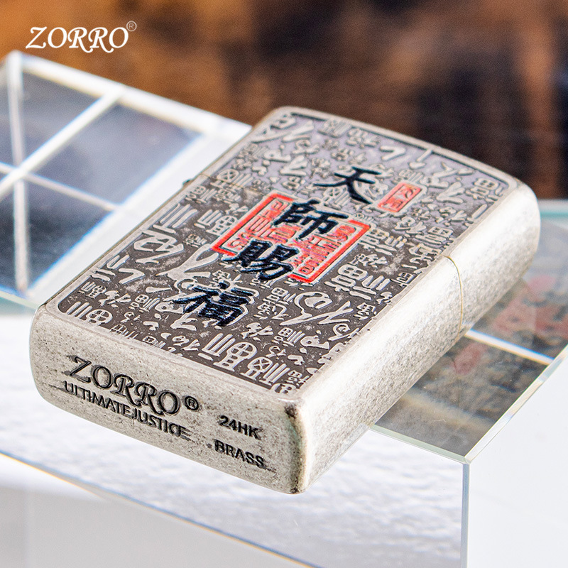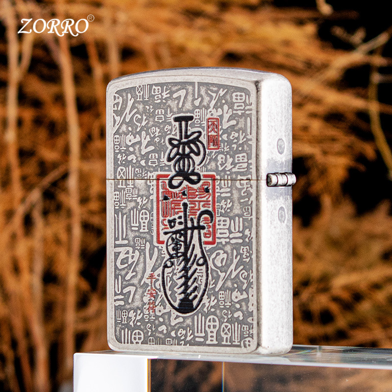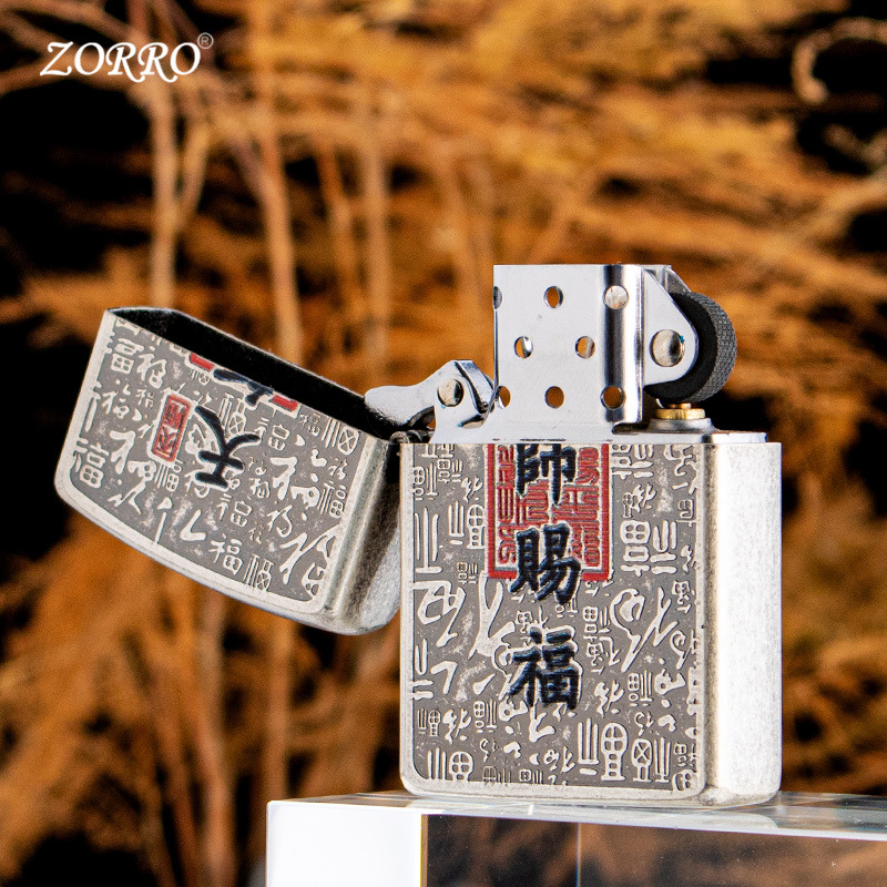 Zorro Peace Blessing Lighter with Double-Sided Engraving, National Style, Ancient Silver, Windproof, Ideal Gift for Men