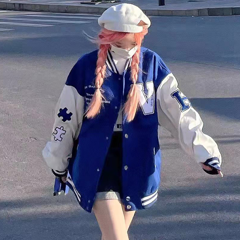 Vast&Hazy Puzzle Baseball Jacket for Women, Preppy Style, American Retro, Couple Abg Hot Girl Design, Blue Jacket