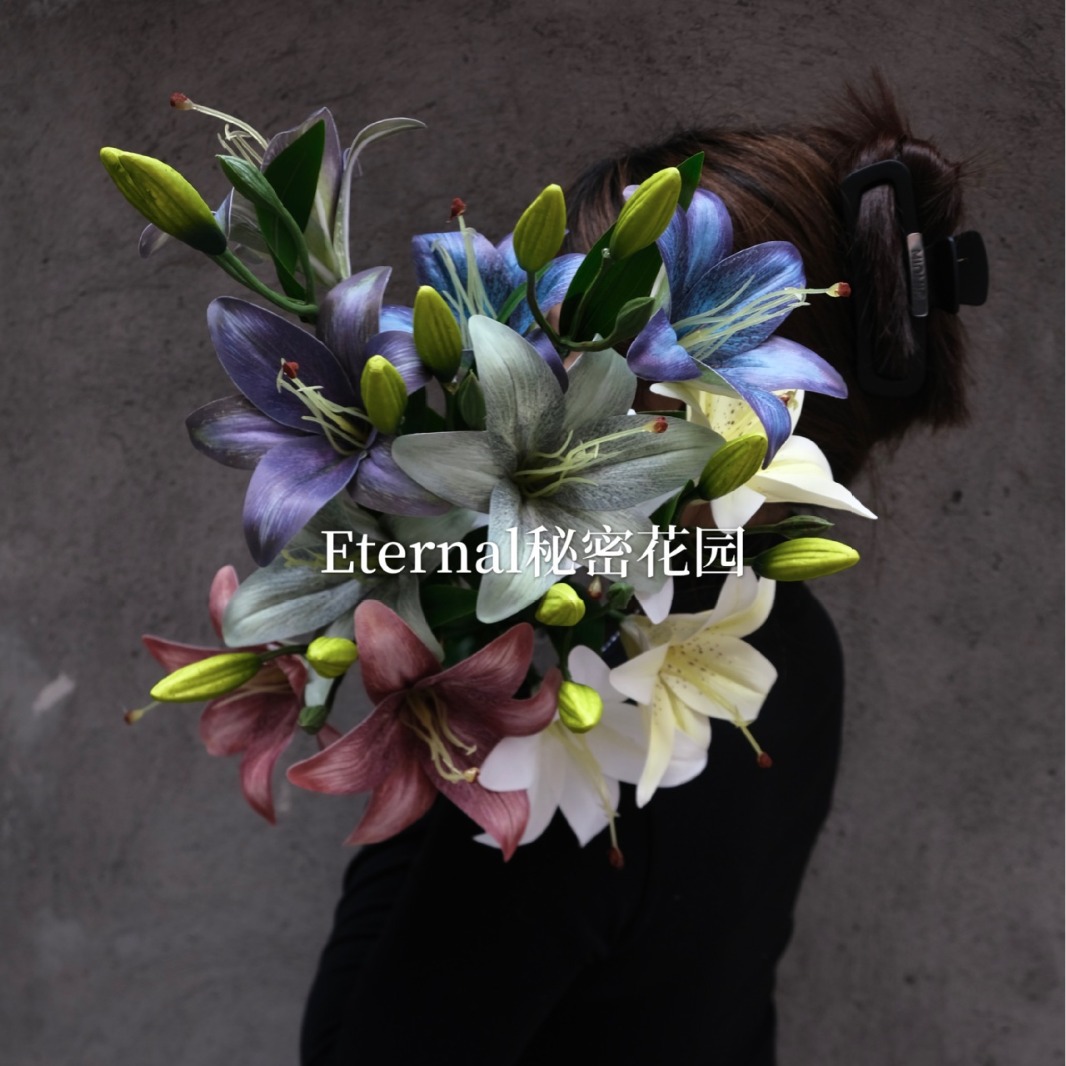 Artificial flower double head 3D lily single oil painting lily bud film blue purple mint green wedding cross-border wholesale