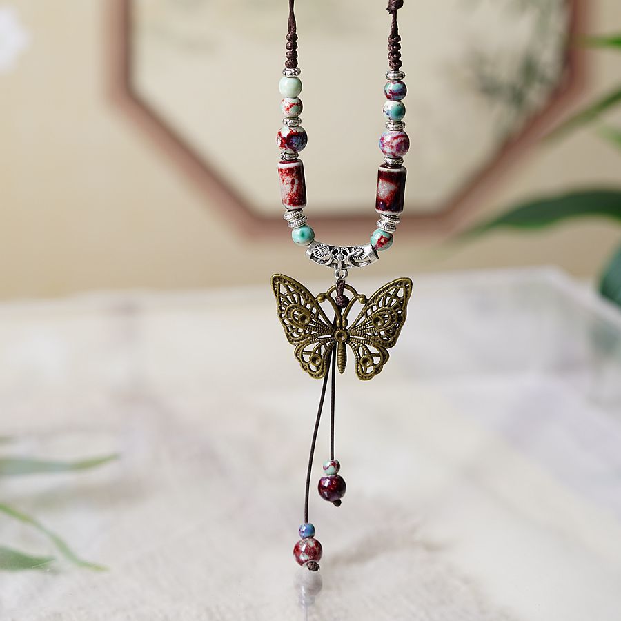 Literature and Art Ethnic Style Imperial Concubine Butterfly Ceramic Long Woolen Chain Women's Antique Style Hanging Ornaments Retro Chinese Style Butterfly Necklace