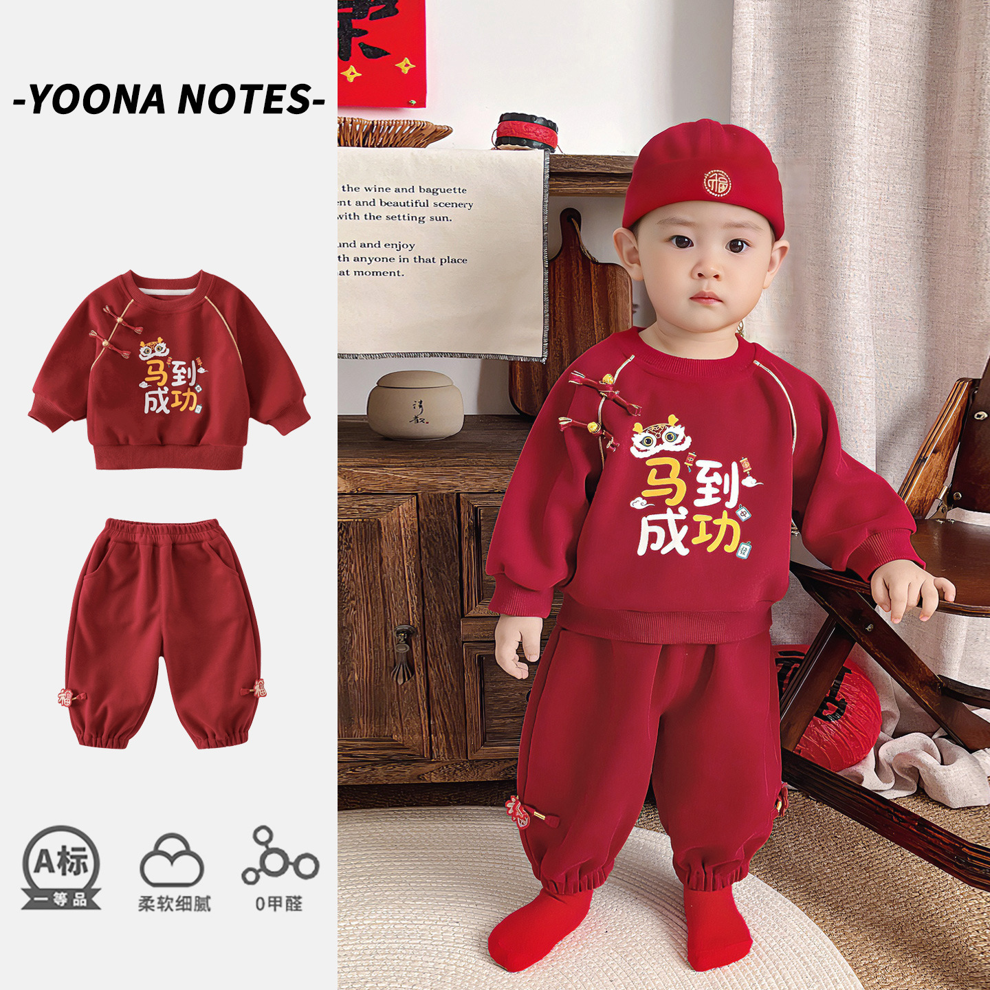 New Year's Greetings Suit for Boys Fleece-Lined Suit Winter 2025 New Kidsren's Clothing Festive New Year's Clothing Boy's Sweatshirt Two-Piece Set