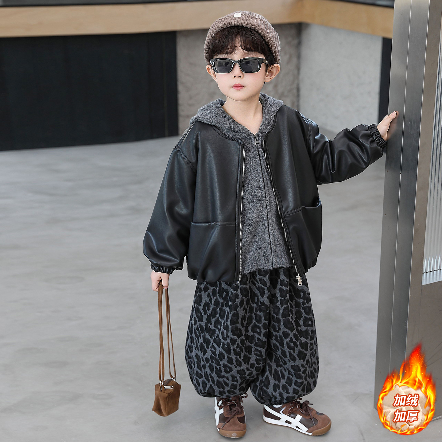 Boys' Fleece Leather Suit Autumn and Winter 2025 New Korean Style Kidsren's Hooded Three-Piece Set Baby Boy's Autum Trendy Clothes
