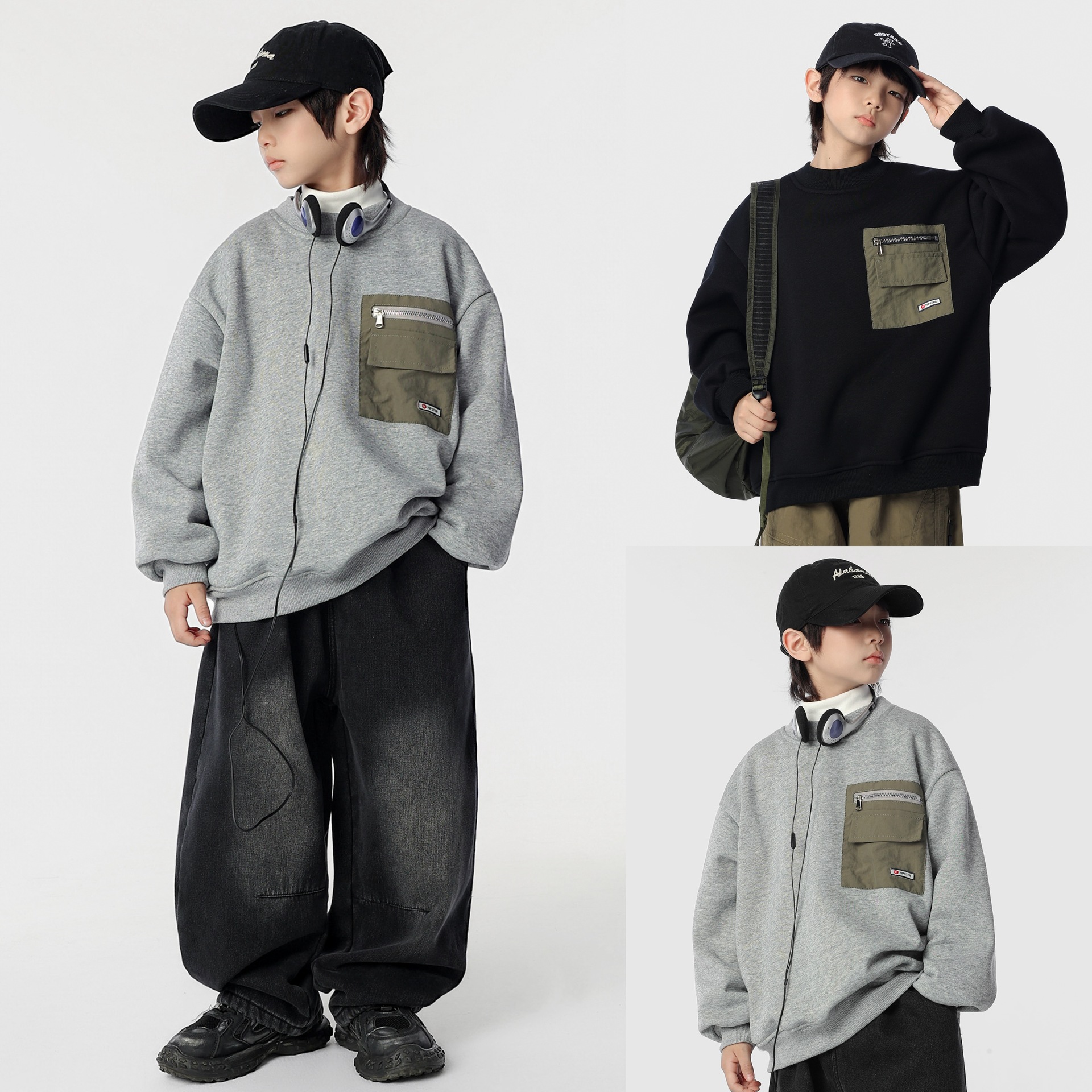 Boys' Japanese-Style Sweatshirt 2025 Autumn and Winter New Children's Pocket Color-Block Top Stylish Baby Boy Fleece Long-Sleeve Trendy