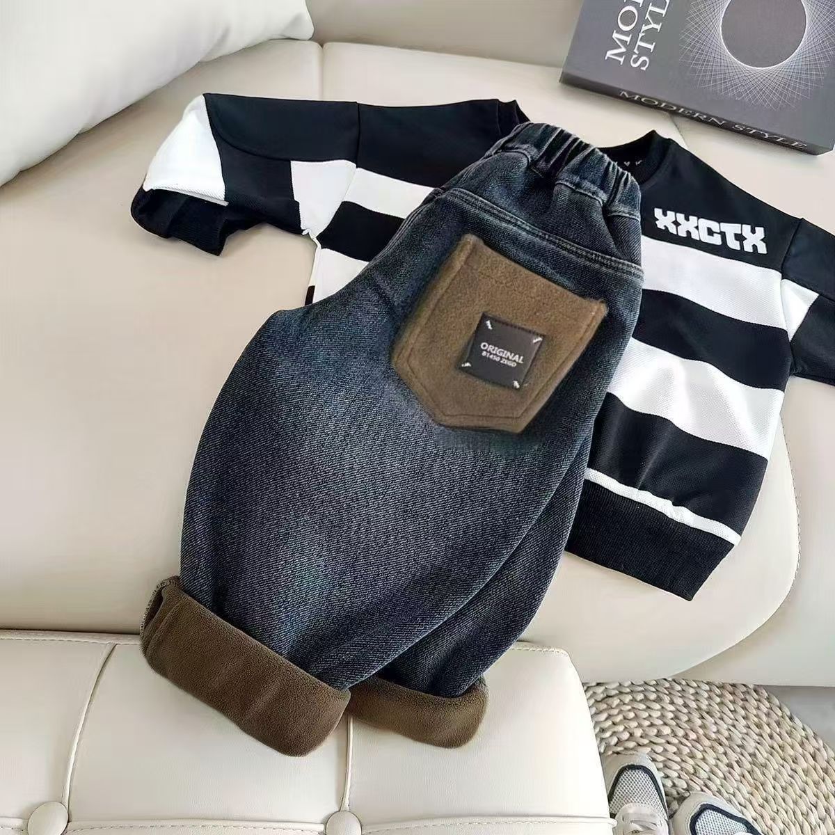 Boys' fleece-lined Jeans Autumn and Winter New Arrival Workwear Pocket for Male Baby Outer Wear Denim Pants Thickened Denim