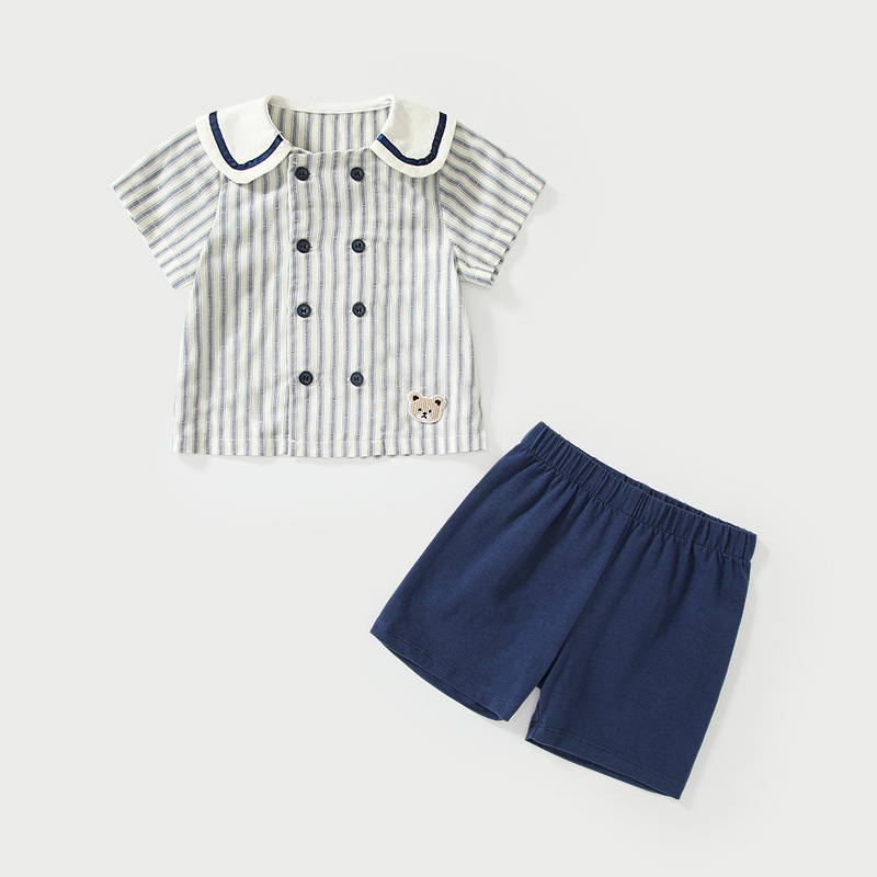 Cross-Border Exclusive Supply - New Baby Boy Solid Color Vertical Striped Short-Sleeve Shirt + Solid Color Shorts Two-Piece Set, Customizable Processing