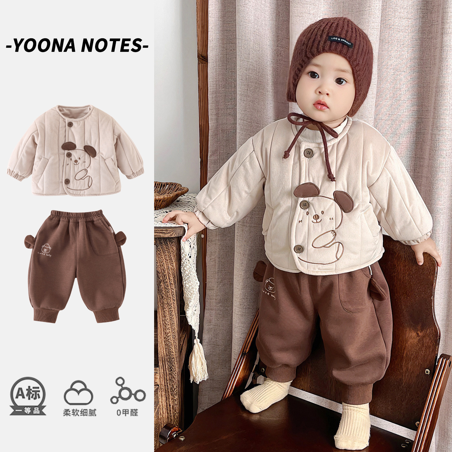 Baby Boy's Late Autumn Quilted Long-Sleeved Cartoon Cute Suit for Infants and Young Children, Autumn and Winter Outing Style Two-Piece Set