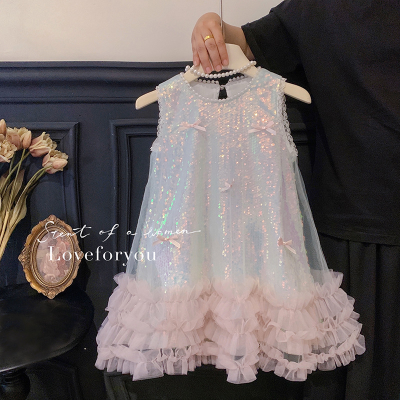 Girl's dress Summer 2025 New Arrival Sequin Vacant Dress Baby Girl's Styish Mesh Dress Elegant Cyber Celebrity Children's Dress