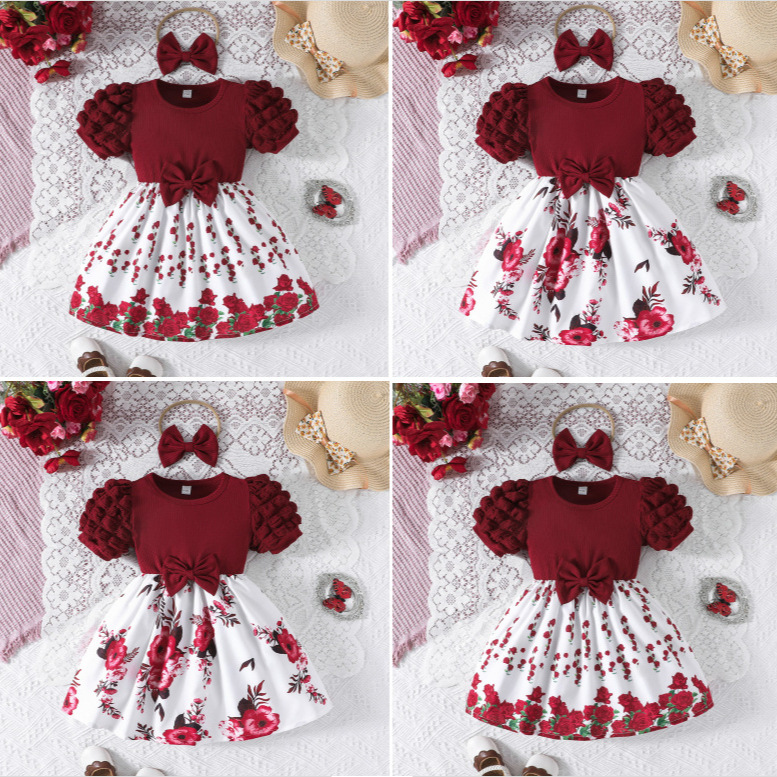 Cross Border 2025 Sweet Baby Girl Bow Decorative Small Floral dress Turban Summer Daily New Style