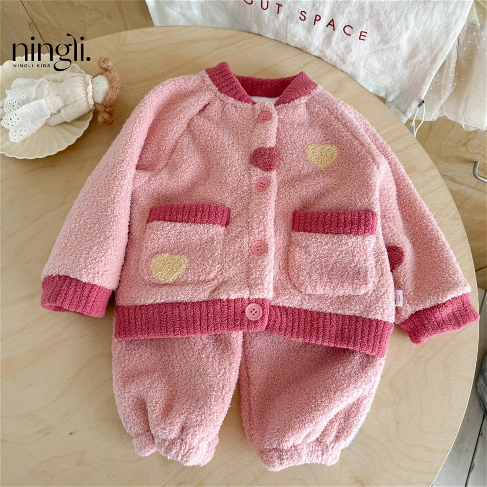 Flannel Suit Children's Baby Girl Two-Piece Set New Furry Jacquard Loose Round Neck Home Clothes