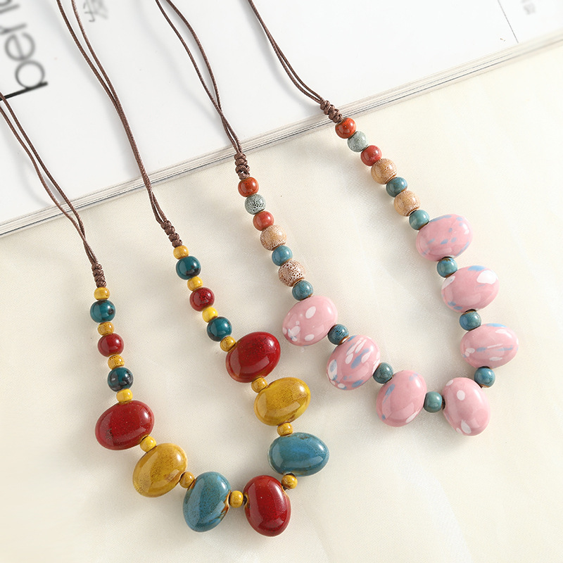 Classic Colorful Bean Ceramic Bead Necklace New Chinese Style Simple Versatile Sweater Chain Handmade Weaving National Trend