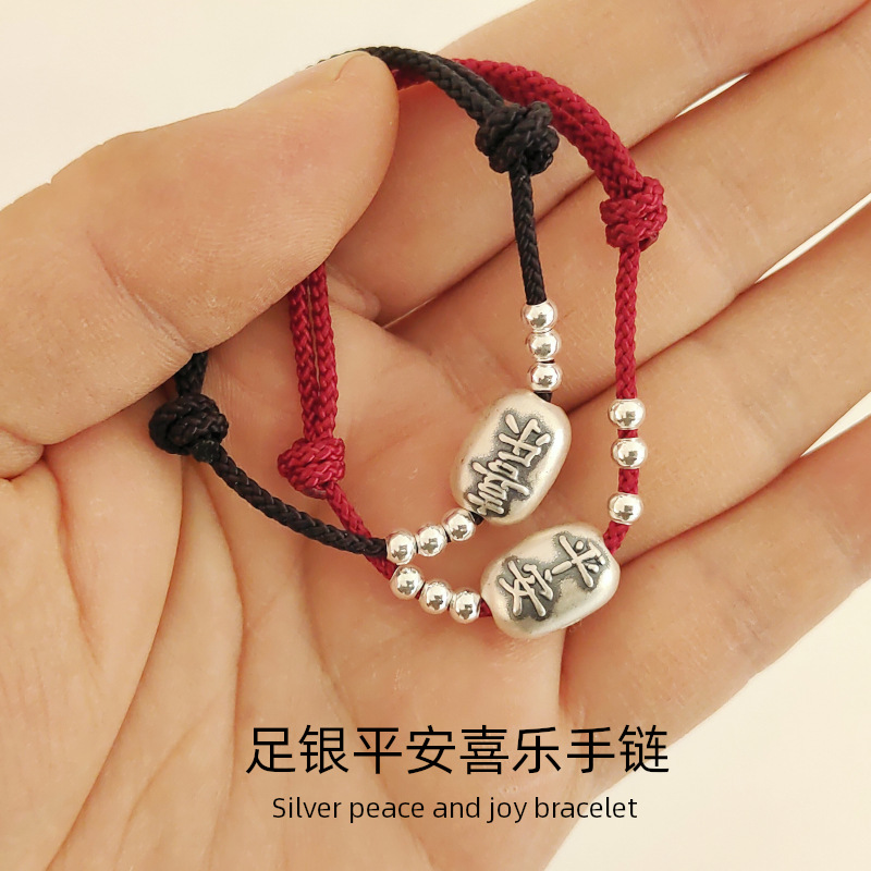 3D Hard Silver 999 Couple's Ping An Buckle Transfer Beads Hand-woven Simple Red and Black Cartoon Bracelet for Men and Women