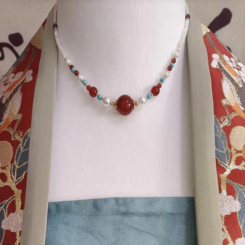 Chinese Antique Style Red Agate Pearl Turquoise Handmade Beaded Necklace Women's Chinese Style New Chinese Style Mother-Of-Pearl Clavicle Chain Necklace
