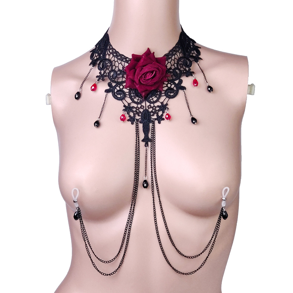New European and American Cross-border Milk Chain Fun Breast Ring Lace Rose Necklace Corset Chain Bikini Body Chain Nipple Chain