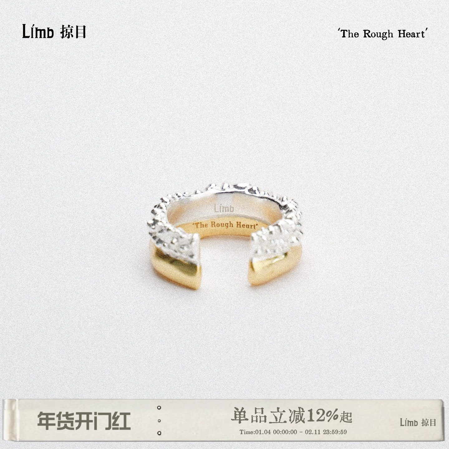 Limb Glance·Rough Heart Original Design Women's High-End Light Luxury Gold and Silver Color-Block Narrow Band Ring