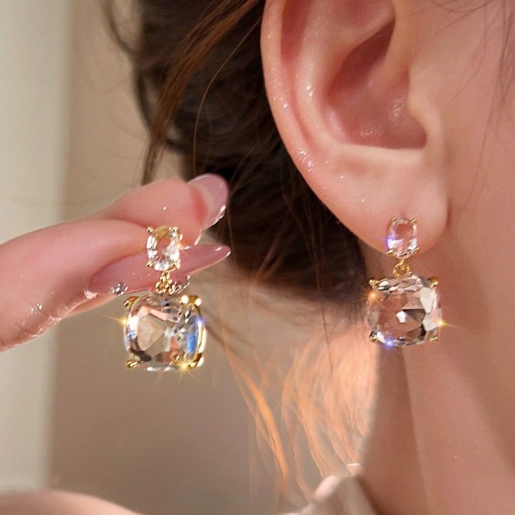 French [Designer] Bella Monroe Accessible Luxury High-End Transparent Square Crystal Silver Needle Earrings for Women