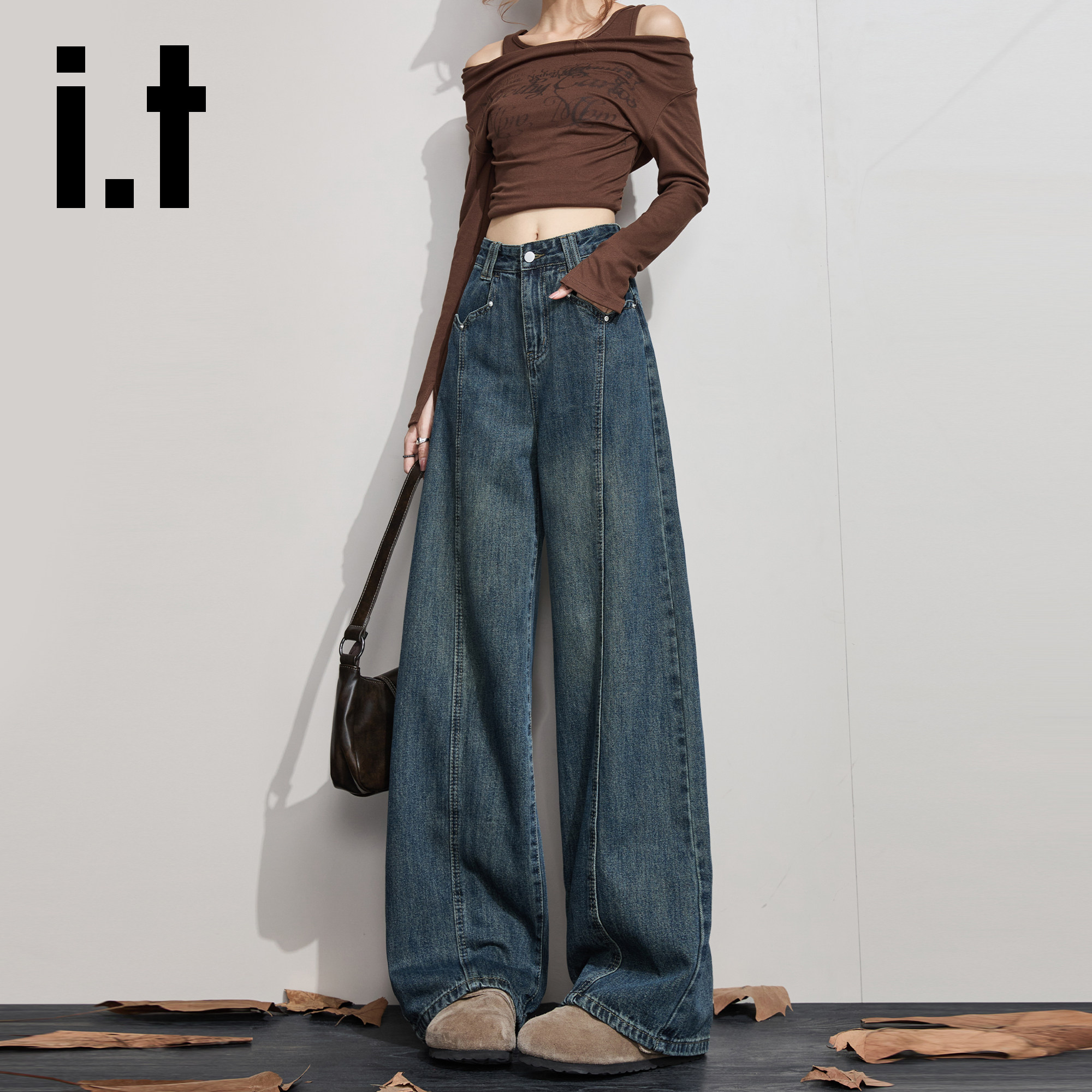 It:Chocoolate American Retro Style Fleece-Lined Wide-Leg Jeans for Women, Tailored for a Slimming and Draping Effect, Floor-Length Pants