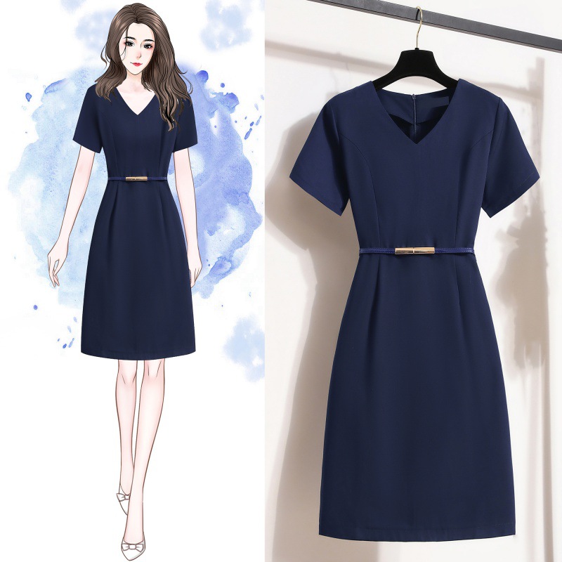 Fashion Elegant Belly-Covering Slimming V-Neck Navy Blue Business Dress Jewelry Shop Beauty Salon Work Clothes Short Sleeve