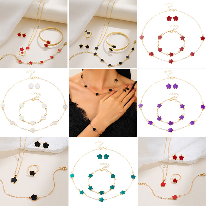 Five-Leaf Clover Five-Piece Set European and American Cross-Border New Lucky Flower Bracelet Bracelet Necklace Ring Earrings Set Versatile Women